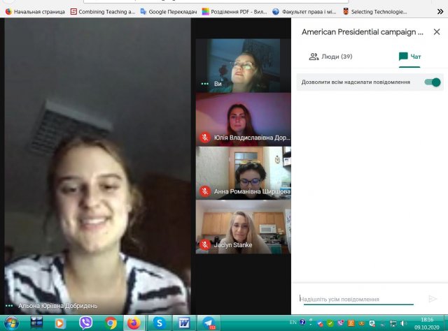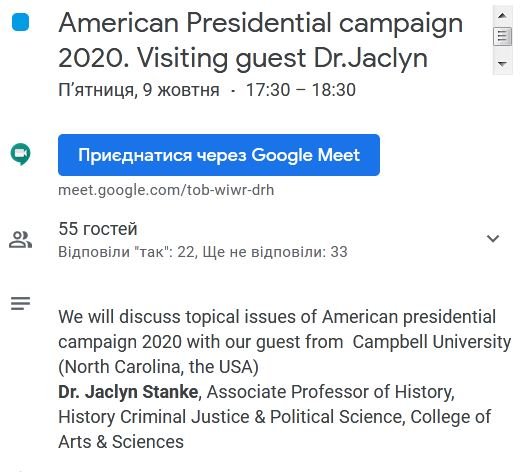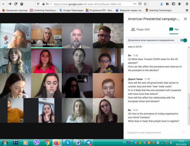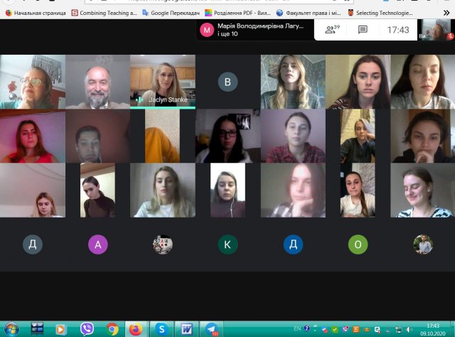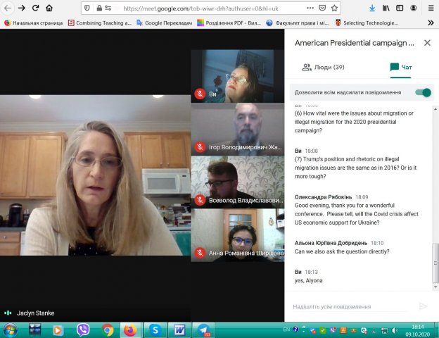 09 жовтня 2020 р. на платформі Google Meet G-Suite Київського університету імені Бориса Грінченка відбулася он-лайн зустріч студентів освітніх програм «Регіональні студії» та «Суспільні комунікації» 4 курсу бакалаврату та 1 та 2 курсів магістратури Факультету права та міжнародних відносин з доктором історичних наук, професором Жаклін Станке, відділення Історії, кримінального правосуддя та політології Коледжу мистецтв і наук, Університет Кемпбелл (Північна Кароліна, США).