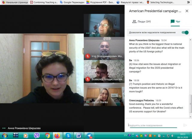 Зустріч зі студентами спеціальності 291 «Міжнародні відносини, суспільні комунікації та регіональні студії» була присвячена актуальним проблемам американської президентської виборчої кампанії 2020 р. та проходила у форматі Q&A (запитання-відповіді). Студенти мали можливість отримати відповіді на питання про інших кандидатів на цьогорічних президентських виборах окрім відомих всьому світу Дж. Байдена та Д. Трампа; про вплив інших політичних сил, окрім Демократичної та Республіканської партій, на вибори та результати голосування; про можливості повтору масових протестів проти Д. Трампа, як це було у 2016 р.; вплив перебігу пандемії COVID-19 на шанси Д. Трампа повторно зайняти посаду президента США. Також можна було дізнатися про процедуру голосування та феномен джеррімандерінгу у Північній Кароліні; про актуальність питань нелегальної міграції в ході президентської кампанії 2020 року. Студенти мали шанс задати питання запрошеній гості як письмово, так і усно, тим самим застосувати на практиці свої знання та вміння спілкування англійською мовою професійного спрямування. Професор Жаклін Станке відмітила високий рівень підготовки українських студентів, зазначивши, що вона приємно вражена обізнаністю наших студентів у сфері зовнішньої та внутрішньої політики США.