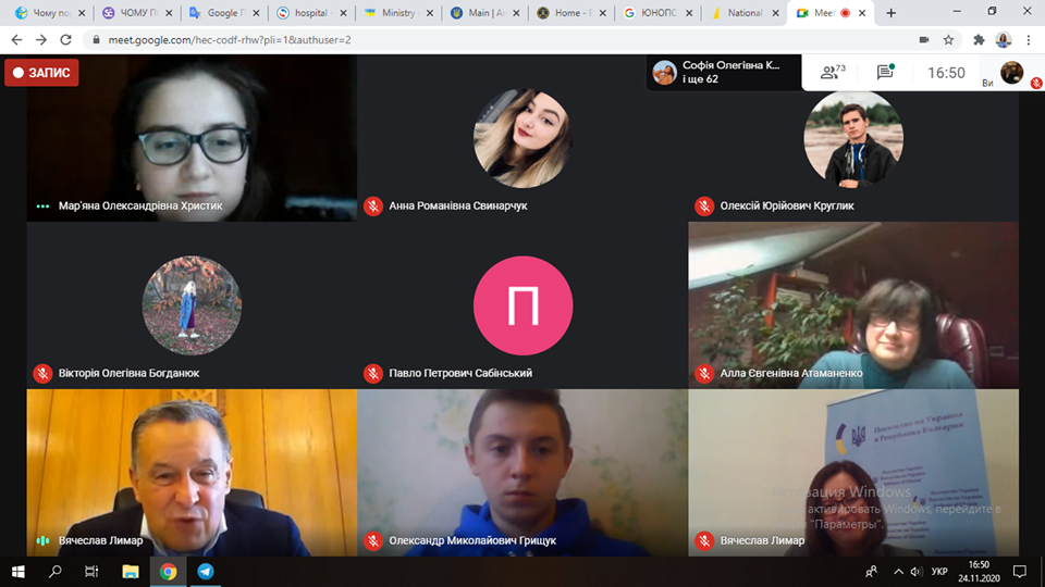 На запрошення колег з Факультету міжнародних відносин Національного університету «Острозька академія» 24 листопада 2020 р. студенти 4 курсу освітніх програм «Суспільні комунікації» та «Регіональні студії» Факультету права та міжнародних відносин Київського університету імені Бориса Грінченка змогли відвідати відкриту лекцію-зустріч з Надзвичайним і Повноважним Послом України в Республіці Болгарія п. Віталієм Москаленком, яка відбувалася на платформі Google Meet.