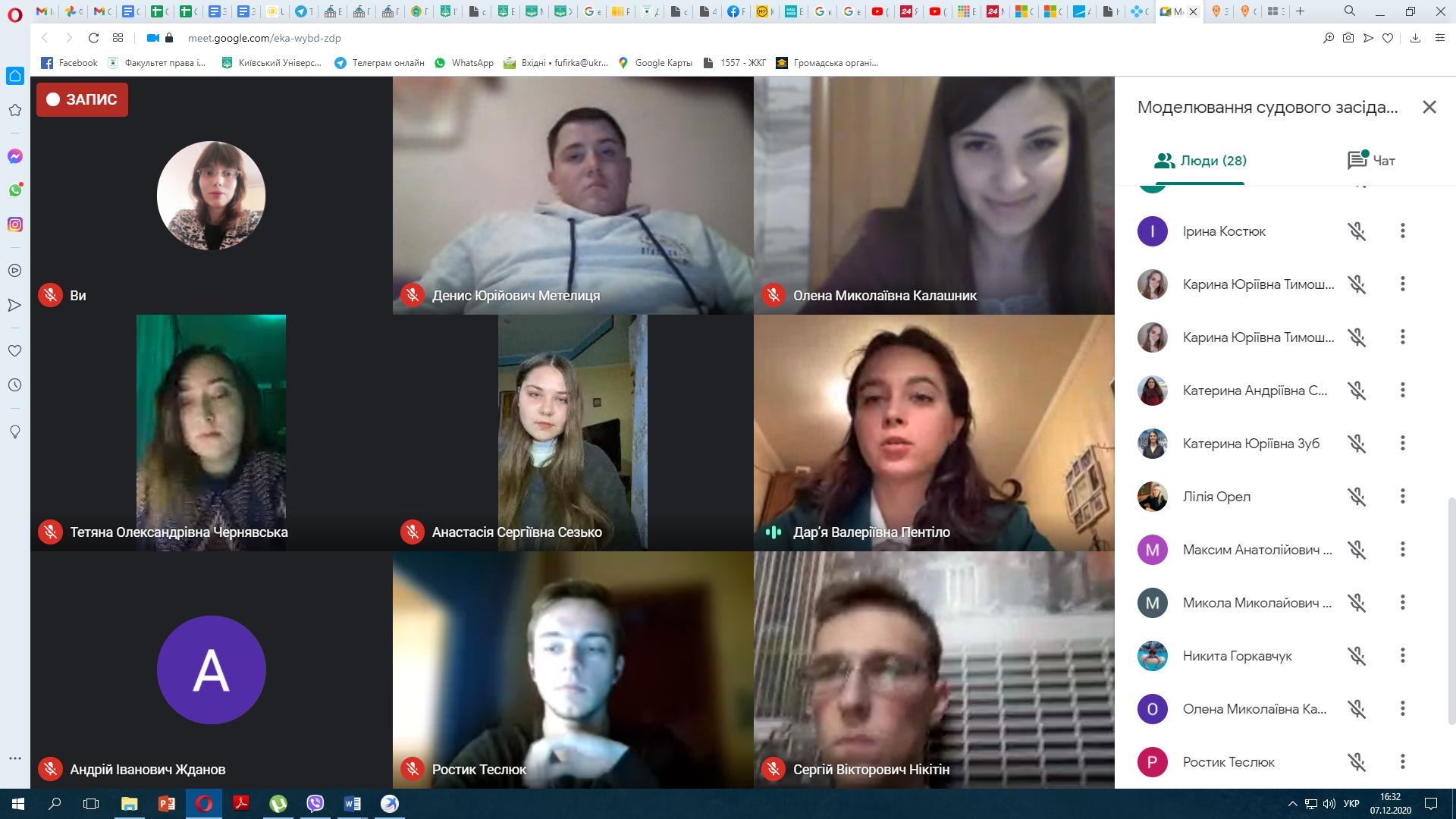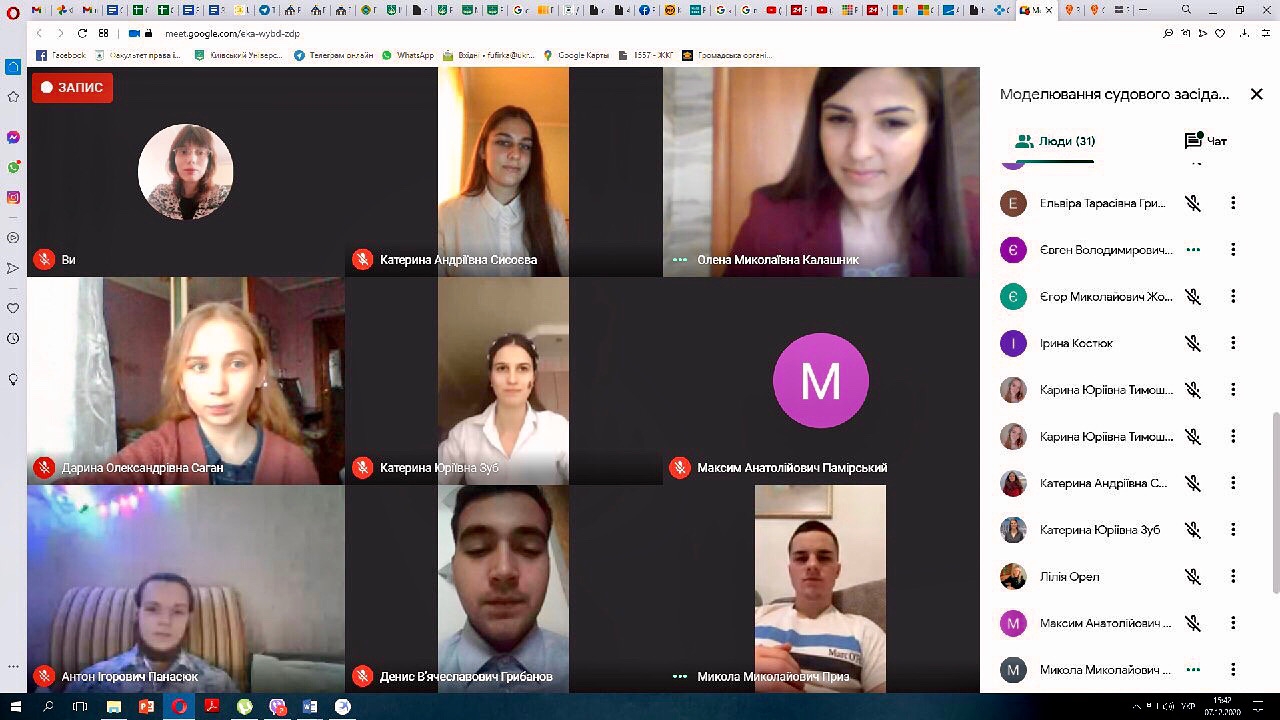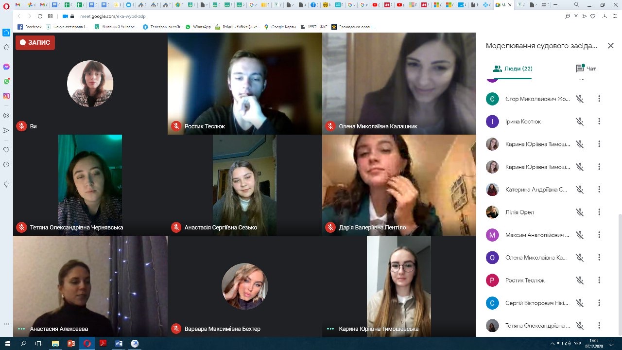 «До Міжнародного дня прав людини та із нагоди святкування Дня Київського університету імені Бориса Грінченка проведено Моделювання судового засідання «Справедливий суд грінченківців». Участь у моделюванні взяли студенти 3-го курсу спеціальності «Право» під керівництвом доцента кафедри публічного та приватного права Факульткту права та міжнародних відносин Калашник Олени Миколаївни. Враховуючи ситуацію, що склалася у світі від пандемії Covid-19, змінилася не лише організація освітнього процесу, а й майже усі суспільні відносини, у тому числі і цивільно-процесуальні. Суди почали активно розглядати справи у режимі відкоконференції, дозволяючи сторонам приймати участь у справі поза межами суду за допомогою власних технічних засобів. Вперше наші студенти провели імітацію судового засідання онлайн. Два зовсім різні кейси та різні підходи розгляду цивільної справи в режимі відкоконференції.