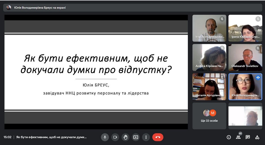 9 червня 2021 р. на Факультеті права та міжнародних відносин відбулася онлайн-зустріч «Як бути ефективним, щоб не докучали думки про відпустку?». Вебінар був ініційований заступником декана з науково-педагогічної та соціально-гуманітарної роботи Наталею Валерівною Барановою, а провела онлайн зустріч завідувачка ННЦ розвитку персоналу та лідерства Юлія Володимирівна Бреус.