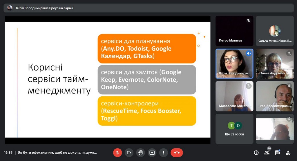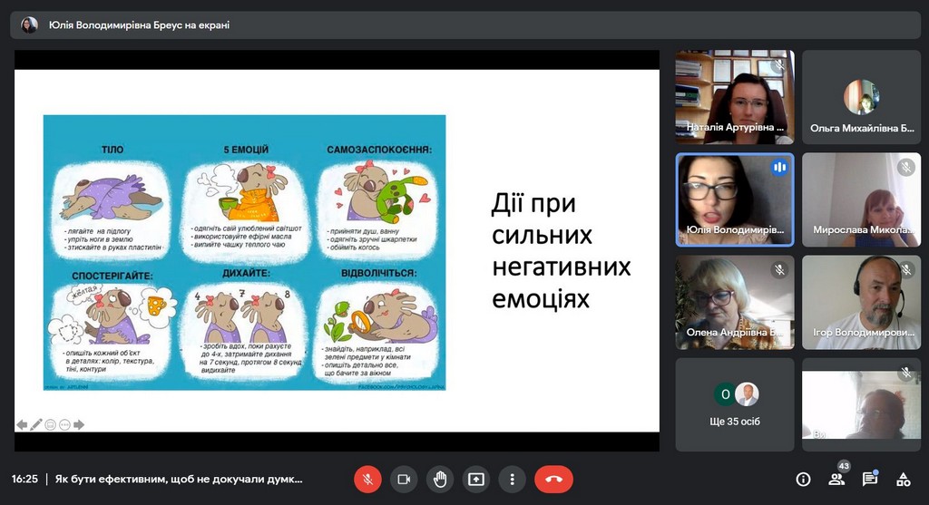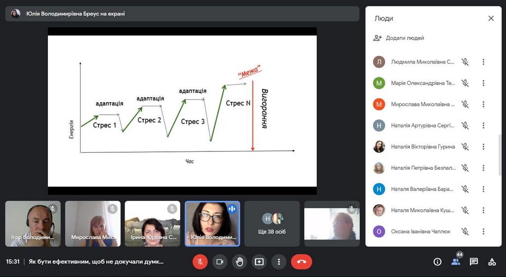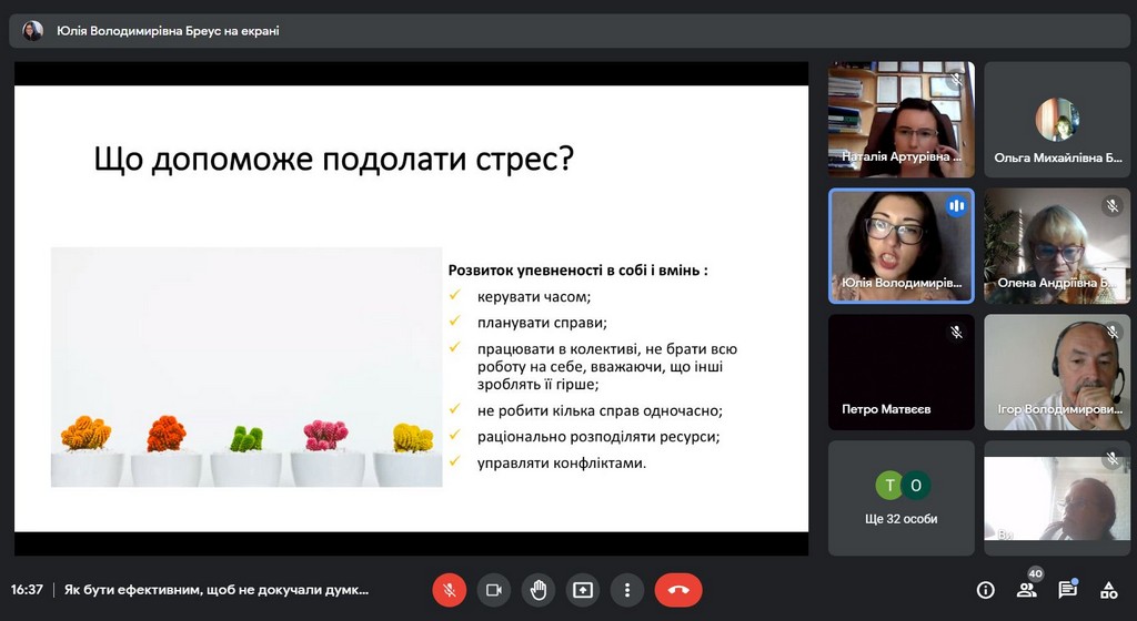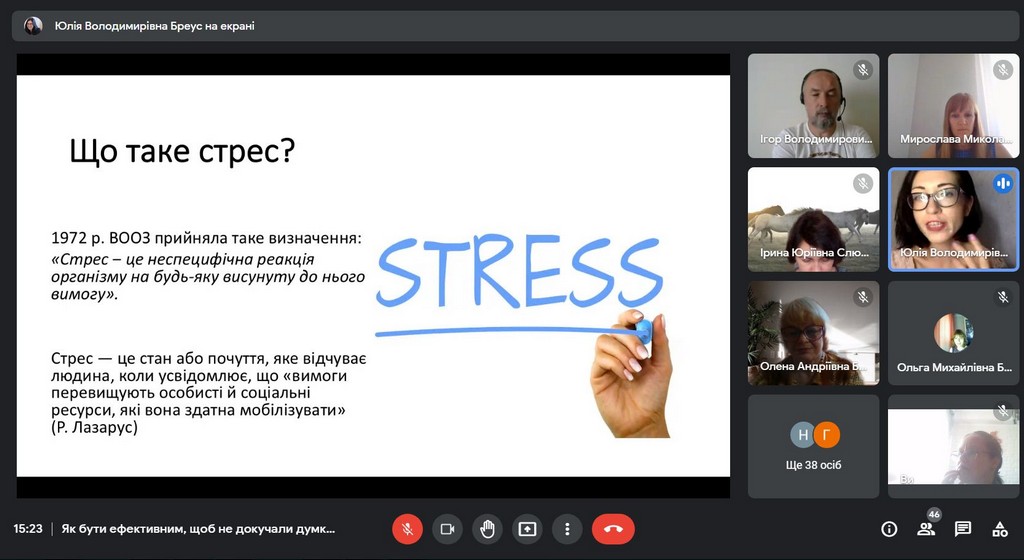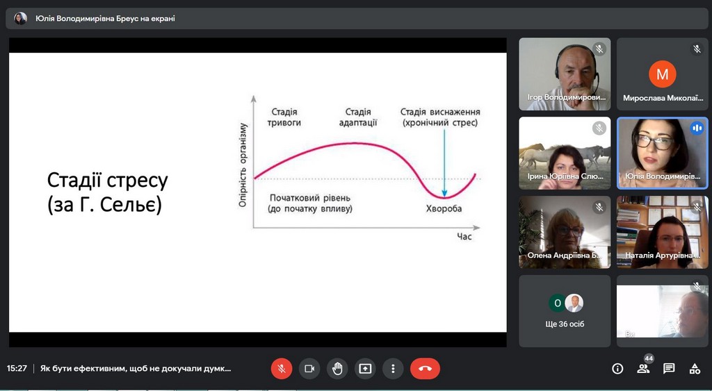 У вебінарі взяли участь викладачі всіх трьох кафедр Факультету: міжнародних відносин та міжнародного права, публічного та приватного права, іноземних мов. Під керівництвом Юлії Володимирівни наші викладачі поспілкувалися про види стресу, їх вплив та накопичувальний ефект у нашому житті; намагалися зрозуміти, що заважає, а що надихає на нові досягнення; розглянули типові проблеми управління часом та способи, як їх вирішити; опанували найбільш дієвими техніками саморегуляції та способами «підзарядки батарейок». Наприкінці зустрічі учасники вебінару намітили план підтримки та відновлення власної працездатності; потренувалися у техніках поповнення «енергетичних ресурсів», дуже потрібних наприкінці навчального року.