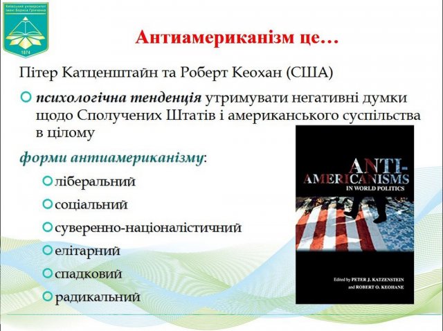 06 жовтня 2021 р. доцент кафедри міжнародних відносин та міжнародного права к.і.н., доцент Бессонова Марина Миколаївна прочитала гостьову лекцію студентам освітньої програми «Країнознавство» першого (бакалаврського) рівня вищої освіти спеціальності 291 «Міжнародні відносини, суспільні комунікації та регіональні студії» у Запорізькому національному університеті. Лекція на тему «Негативне ставлення до певних країн/народів (на прикладі антиамериканізму)» відбувалася в рамках курсу «Конфліктологія та теорія переговорів». У ході лекції було запропоновано огляд сучасних підходів до інтерпретацій такого явища як «антиамериканізм», охарактеризовано наукові та прикладні дослідження цього феномену, показано масштабність та універсальність цього явища, яке спостерігається у всіх регіонах сучасного світу. В ході лекції студенти разом з гостьовим лектором визначали про- та антиамериканські погляди у різних народів світу, з’ясовували специфіку «спадкового» антиамериканізму, дізнавалися про підґрунтя масовості негативного сприйняття США у Росії та інших країнах світу. Сподіваємося на подальшу співпрацю з колегами кафедри всесвітньої історії та міжнародних відносин Запорізького національного університету.