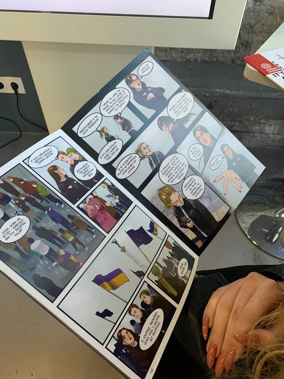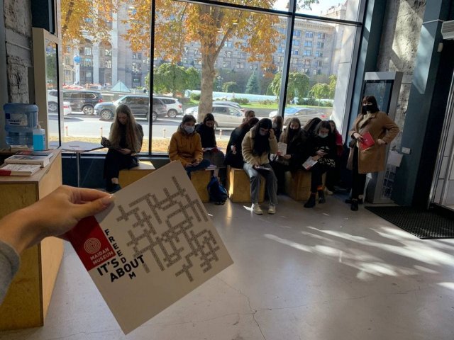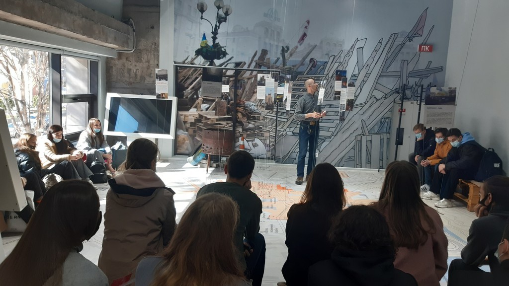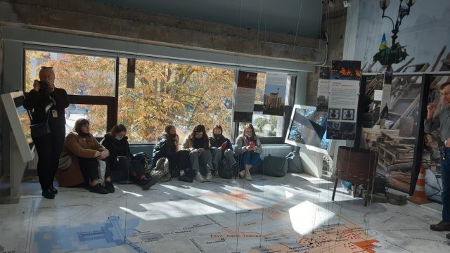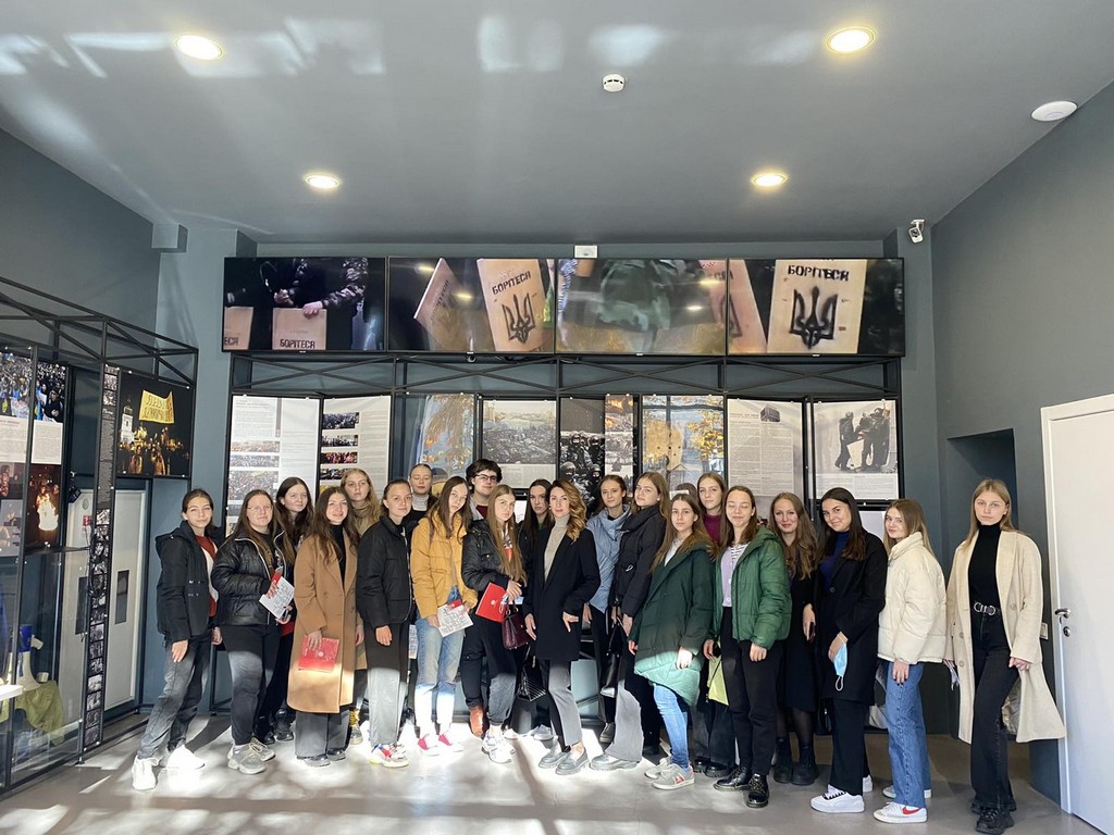 Напередодні Дня захисників та захисниць України студенти першого курсу освітніх програм бакалаврату «Суспільні комунікації» та «Регіональні студії» відвідали Інформаційний центр Національного меморіального комплексу Героїв Небесної Сотні – Музею Революції Гідності, що знаходиться у Будинку профспілок на Майдані Незалежності у м. Київ. Студенти та куратори Олена Володимирівна Пістракевич та Марина Миколаївна Бессонова ознайомилися з експозицією "Назустріч свободі!", що присвячена подіям Революції Гідності, стилізованою картою Майдану, ключовими місцями Революції Гідності, де перебували силовики і мітингарі, розміщувалися барикади. Екскурсію проводив науковий співробітник Музею Віктор Кривоносов, який був активним учасником Євромайдану та Революції Гідності, брав участь в антитерористичній операції на Сході України.