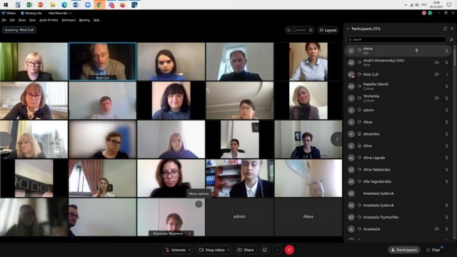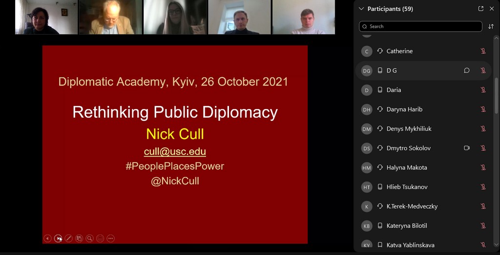 Cтуденти освітніх програм «Суспільні комунікації», «Регіональні студії» та «Міжнародне право» першого (бакалаврського) та «Суспільні комунікації» та «Регіональні студії» другого (магістерського) рівнів, разом з науково-педагогічними працівниками кафедри міжнародних відносин та міжнародного права: доцентками О.А. Брайчевською, Г.М. Мельник, І.Ю. Слюсаренко та старшою викладачкою М.М. Лісовською відвідали онлайн-лекцію «Rethinking public diplomacy» професора публічної дипломатії Ніколаса Дж. Калла. Лекція пройшла у Дипломатичній академії України імені Геннадія Удовенка при Міністерстві закордонних справ України.