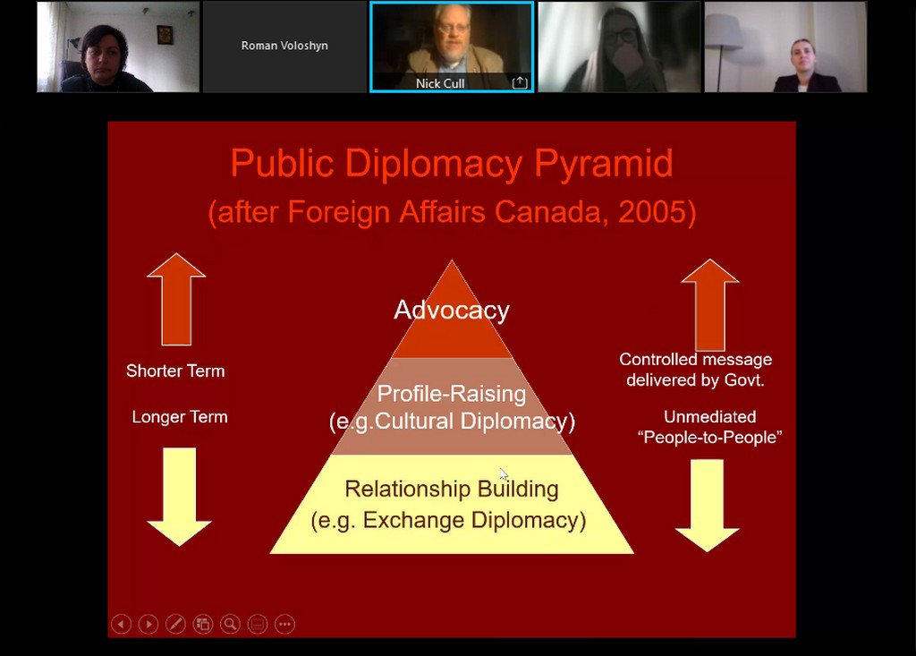 Студенти та викладачі ознайомилися з баченням професором Н. Дж. Каллом п’яти головних компонентів публічної дипломатії, його розумінням «нової публічної дипломатії» та її складових, новими пріоритетами та проблемами, які постають перед цим важливим напрямком сучасної дипломатичної діяльності.