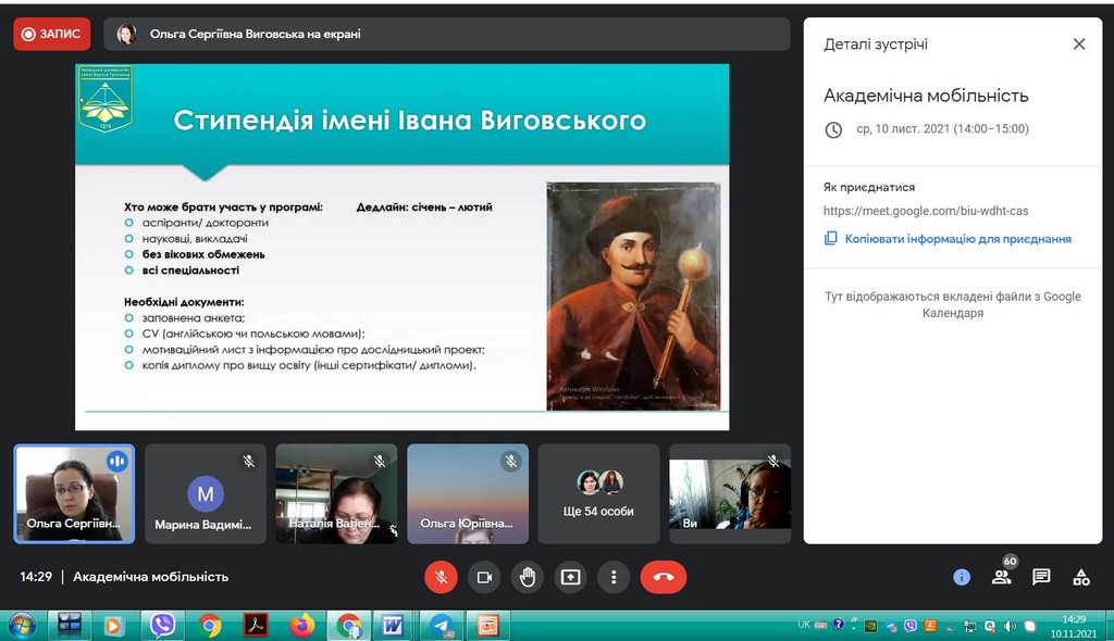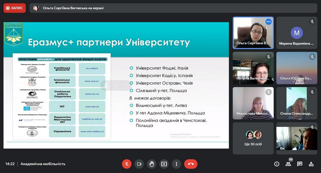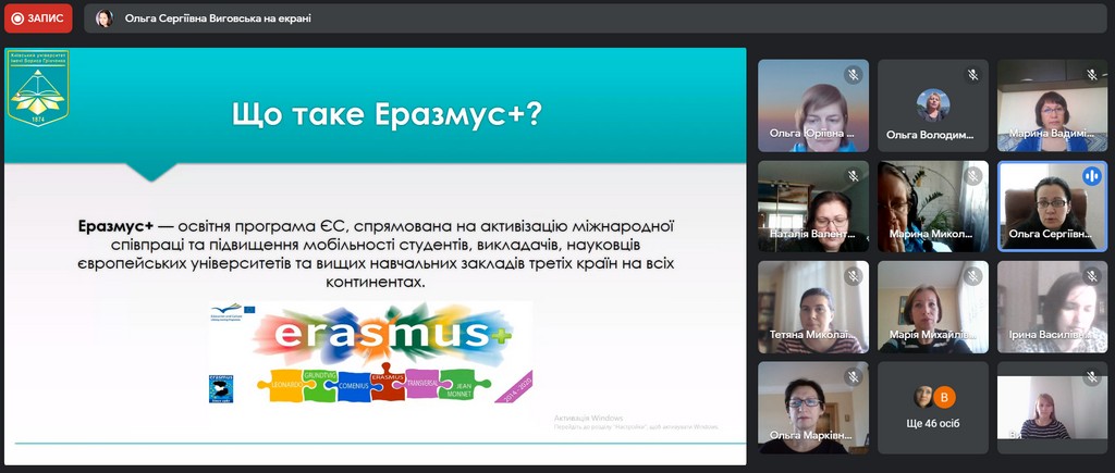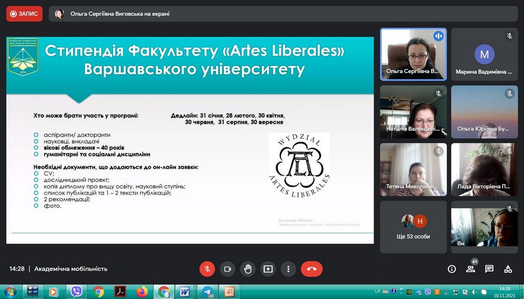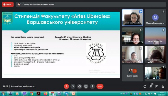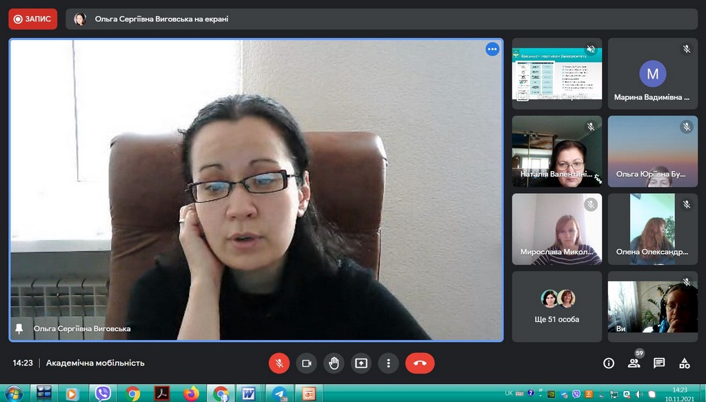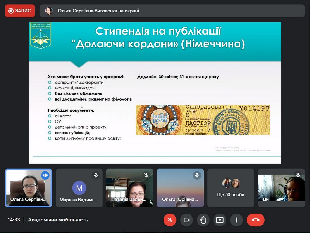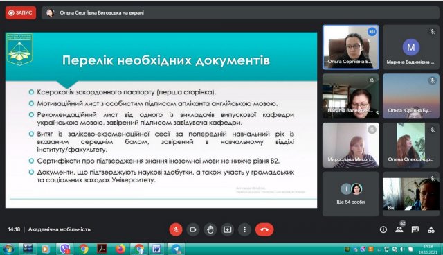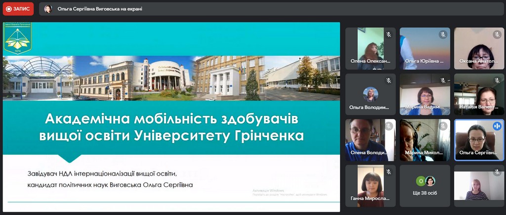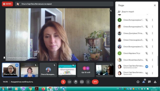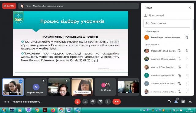В рамках інтернаціоналізації вищої освіти у Київському університеті імені Бориса Грінченка відбулася інформаційна он-лайн зустріч для кураторів та зацікавлених викладачів щодо можливостей міжнародної академічної мобільності. Зустріч була ініційована Ольгою Сергіївною Виговською, завідувачкою Науково-дослідної лабораторії інтернаціоналізації вищої освіти, кандидатом політичних наук, доцентом кафедри міжнародних відносин та міжнародного права.