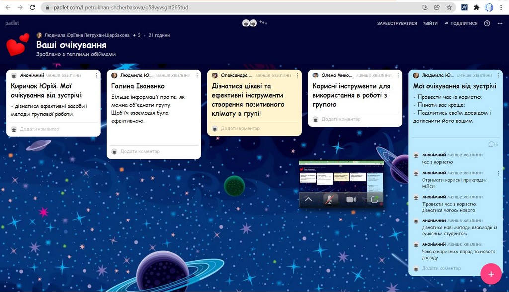 Студентоцентроване освітнє середовище Київського університету імені Бориса Грінченка передбачає допомогу та консультування кураторів академічних груп для ефективної та успішної роботи зі здобувачами вищої освіти. В рамках такої допомоги 25 листопада 2021 р. для кураторів була проведена лекція-тренінг «Особливості формування позитивного соціально-психологічного клімату в студентській групі». Заступник декана з науково-педагогічної та соціально-гуманітарної роботи Факультету здоров’я, фізичного виховання і спорту, кандидат педагогічних наук, старший викладач кафедри спорту та фітнесу, тренер, фасилітатор Людмила Юріївна Петрухан-Щербакова. Під час зустрічі куратори обговорили особливості формування, складові, показники соціально-психологічного клімату в академічних групах, поділилися своїм досвідом щодо «правил» та «табу», «традицій», які формуються у групах. Під час тренінгу були рекомендовані інструменти роботи зі здобувачами академічних груп, а також обговорені проблеми та перспективи, актуальні для груп першокурсників, роль корпоративної культури Київського університету імені Бориса Грінченка, переваги університетського цифрового кампусу та інших вимірів сприятливого освітнього середовища. Під час тренінгу були застосовані інтерактивні методики і вигляді за допомогою padlet.com та webwhiteboard.com. В онлайн лекції-тренінгу брали участь куратори академічних груп Факультету права та міжнародних відносин освітніх програм «Міжнародне право», «Регіональні студії», «Суспільні комунікації» та «Право»: Братко Ірина Василівна, Бессонова Марина Миколаївна, Пістракевич Олена Володимирівна, Терещук Марія Олександрівна.