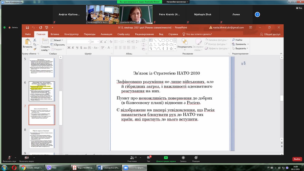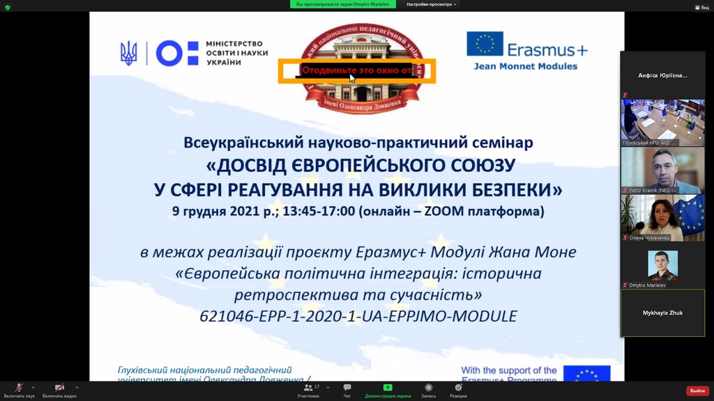 09 грудня 2021 р. професор кафедри публічного та приватного права А.Ю. Нашинець-Наумова взяла участь у Всеукраїнському науково-практичному семінарі «Досвід Європейського Союзу у сфері реагування на виклики безпеки», який проходив у межах реалізації проекту Еразмус+ Модулі Жана Моне «Європейська політична інтеграція: історична ретроспектива та сучасність».