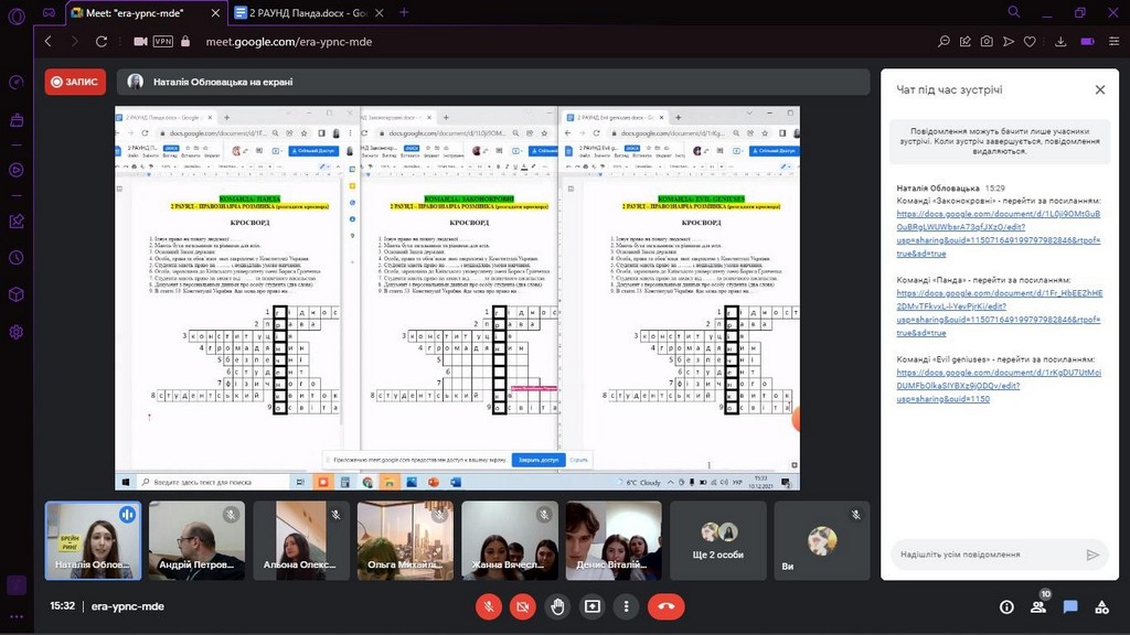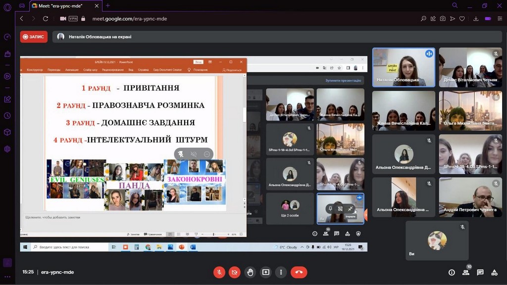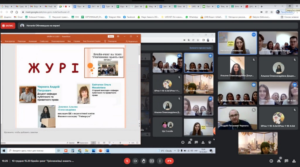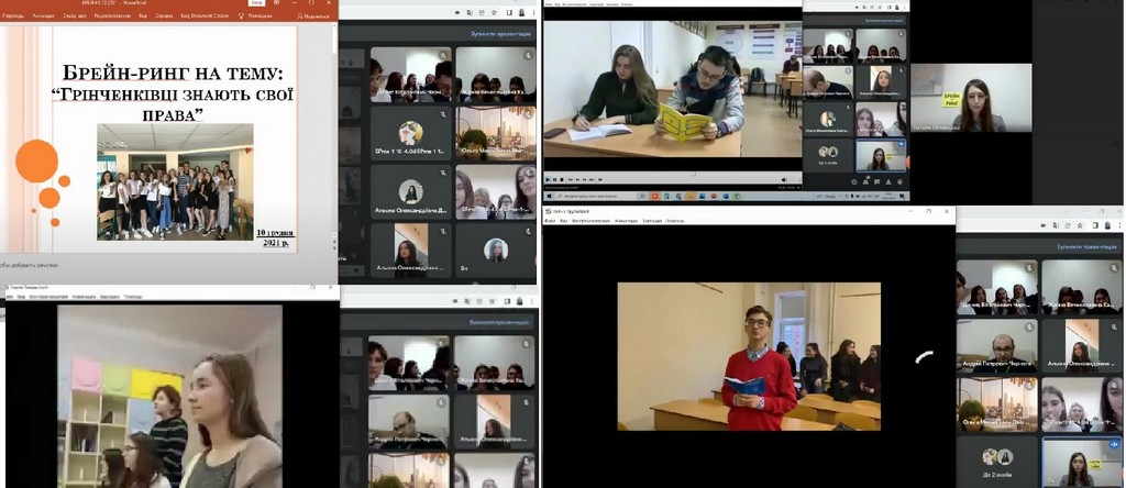 В рамках Грінченківської декади та Тижня прав людини 10 грудня 2021 р. кафедра публічного та приватного права провела онлайн змагання, з використанням сервісу Google Meet, у грі Брейн-ринг на тему: «Грінченківці знають свої права” між студентами спеціальності «Право» Факультету права та міжнародних відносин і студентами спеціальності «Соціальна педагогіка» Фахового коледжу «Універсум». Захід був спрямований перевірку знань студентів основних соціальних прав людини та студентів.
