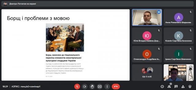 15 лютого 2022 року відбулася онлайн-лекція для здобувачів другого (магістерського) рівня освітньої програми «Регіональні студії» Дмитра Потапова, випускника кафедри міжнародних відносин та міжнародного права, спеціальності 291 «Міжнародні відносини, суспільні комунікації та регіональні студії», менеджера з міжнародних комунікацій Громадської організації «Інститут культури України». Головна мета даної організації – забезпечення охорони культурної спадщини, зокрема, збереження ідентичної уніфікованої української кухні та популяризації України в світі, становлення у громадах українських культурних цінностей.