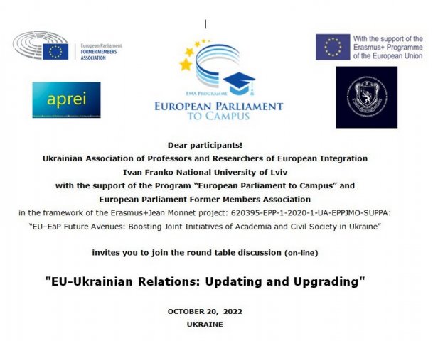 20 жовтня 2022 р. здобувачі бакалаврських та магістерських програм «Суспільні комунікації», «Регіональні студії» та «Міжнародне право» мали можливість долучитися до дискусії у форматі онлайн круглого столу на тему «Відносини Україна-ЄС: оновлення та вдосконалення» (EU-Ukrainian Relations: Updating and Upgrading). Круглий стіл був організований Українською асоціацією викладачів і дослідників європейської інтеграції, Львівським національним університетом імені Івана Франка за підтримки Програми «Європейський парламент – кампусу» та Асоціації колишніх членів Європейського парламенту в рамках проєкту «ЄС-Східне партнерство: майбутні шляхи активізації спільних ініціатив академічних та громадських спільнот в Україні» (Erasmus+ Jean Monnet project: 620395-EPP-1-2020-1-UA-EPPJMO-SUPPA: “EU–EaP Future Avenues: Boosting Joint Initiatives of Academia and Civil Society in Ukraine”). На запрошення організаторів Ірини Сікорської та Романа Калитчака завітали студенти зі Львову, Харкова, Дніпра, Рівно та Києва.