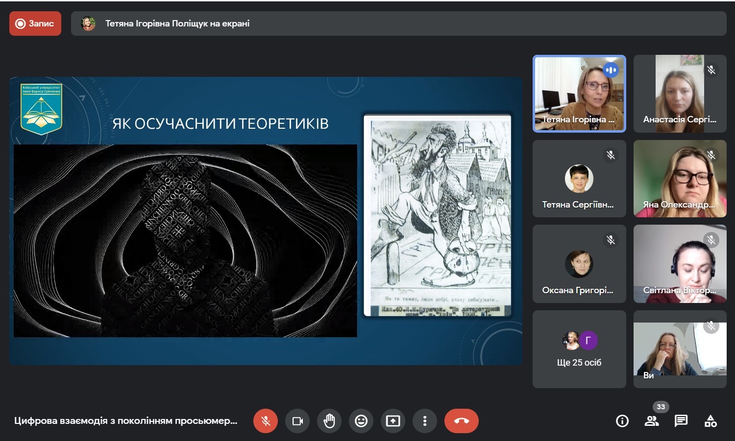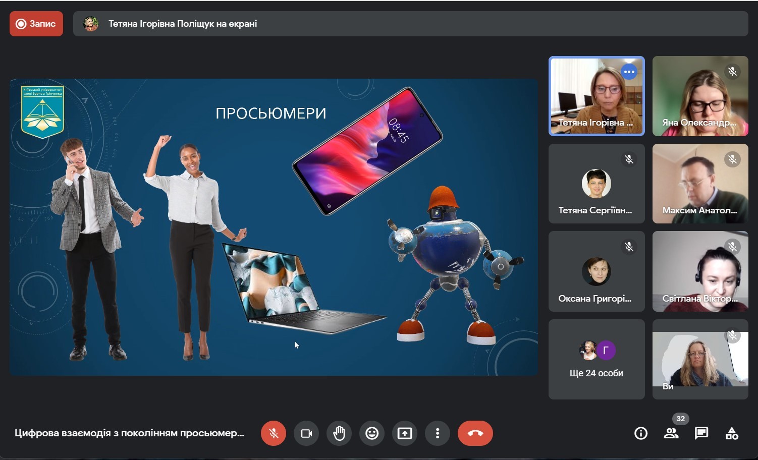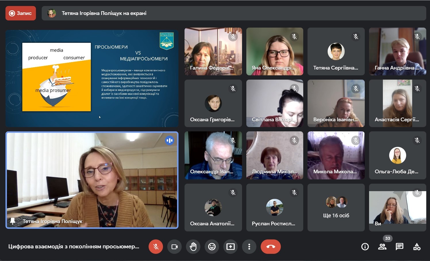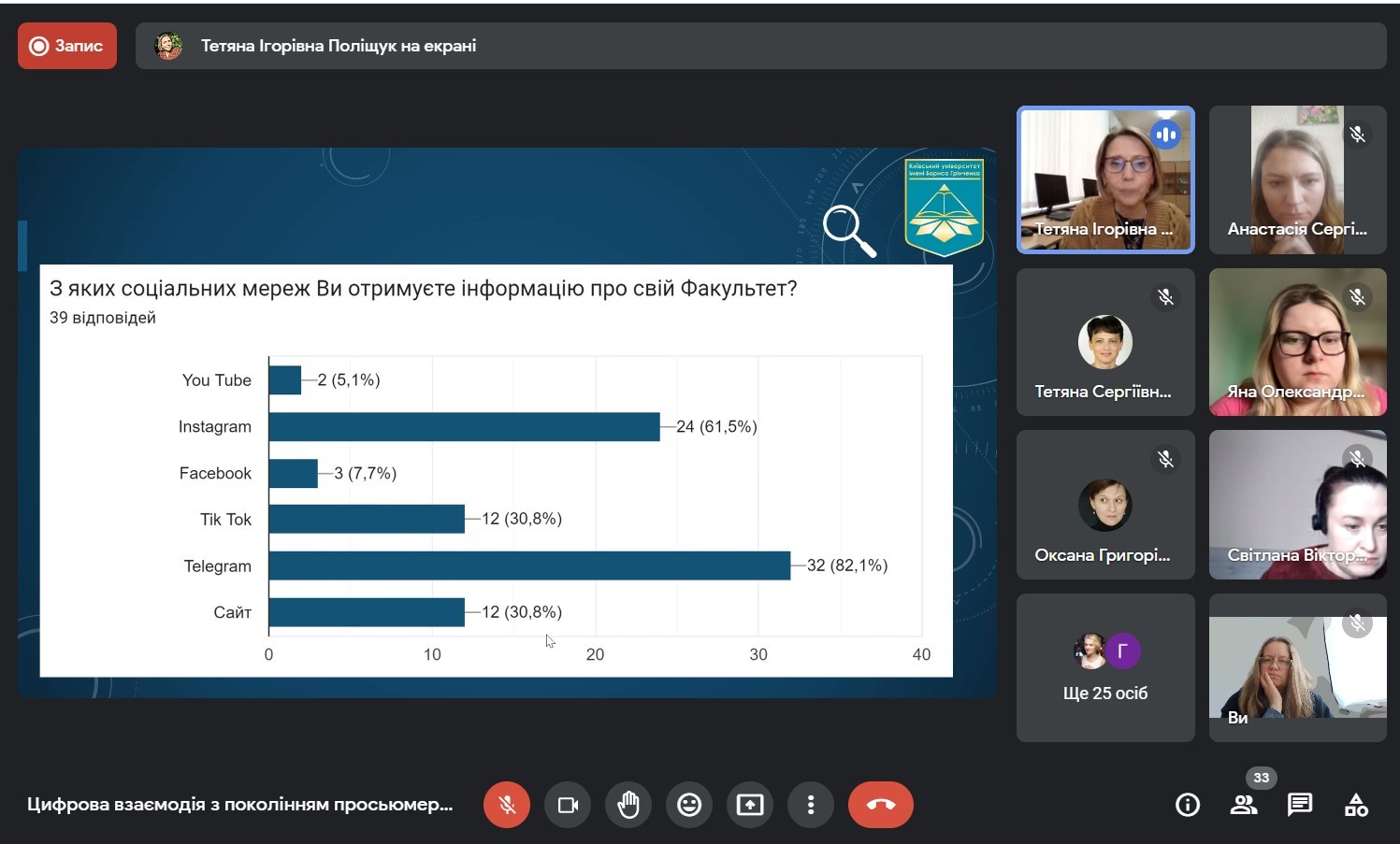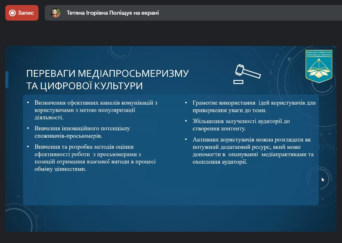 Захід був проведений Тетяною Ігорівною Поліщук, заступником декана Факультету журналістики з науково-педагогічної та соціально-гуманітарної роботи. Присутніх ознайомили з поняттям “просьюмерів”; з психологічними характеристиками цієї групи; про ставлення представників цього покоління до контенту; з основними тенденціями серед молоді стосовно лідерів думок, і як це змінилося під час війни.