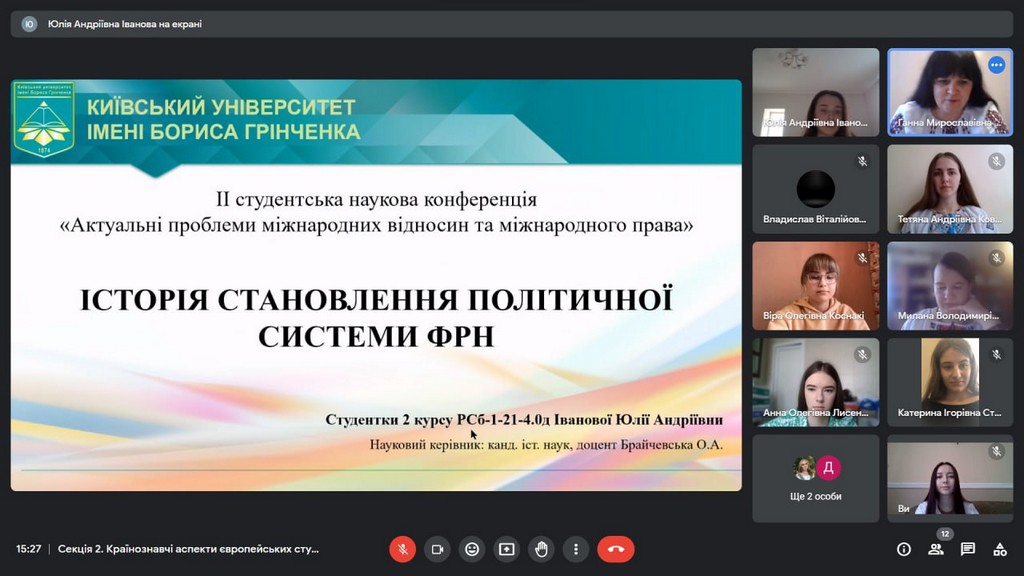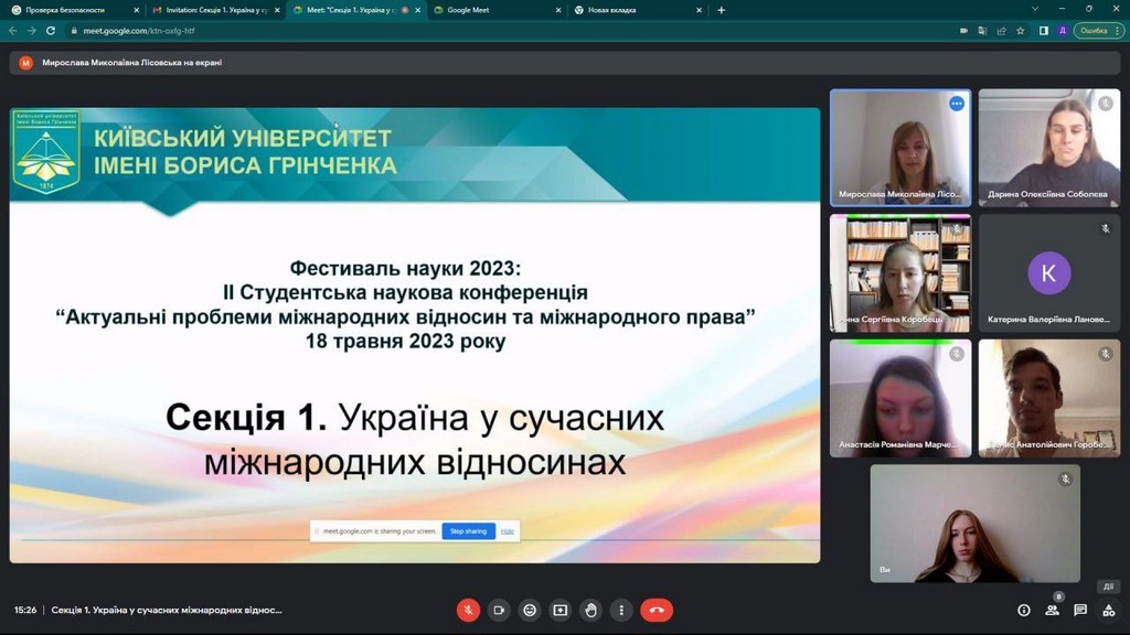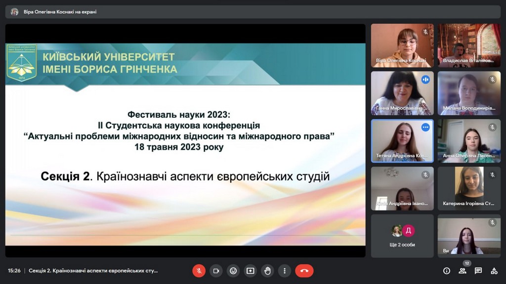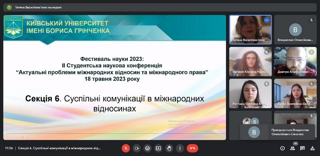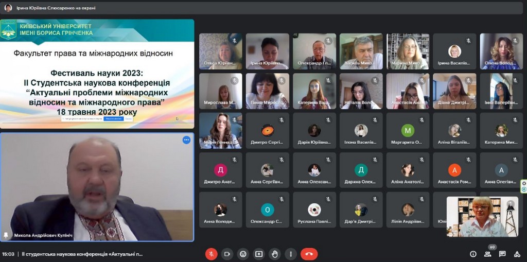 18 травня 2023 р. в рамках Фестивалю науки - 2023 в Київському університеті імені Бориса Грінченка на Факультеті права та міжнародних відносин відбулася ІІ Студентська наукова конференція «Актуальні проблеми міжнародних відносин та міжнародного права». У зв’язку із постійними загрозами ракетних обстрілів з боку держави-агресора конференція проходила в онлайн форматі.
