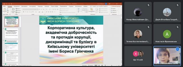 8 жовтня 2023 року на платформі Google Meet відбулась зустріч заступника завідувача кафедри приватного права, старшого викладача Байталюк О.М. зі студентами 1-2 курсів спеціальності «Право» під час якої студентів було проінформовано щодо основних засад корпоративної культури та академічної доброчесності Університету, заходів, які вживаються в Університеті щодо протидії корупції, дискримінації, сексуальним домаганням, булінгу та надано контакти для звернень, у подібних випадках. Крім того студенти отримали інформацію про діяльність Соціально-психологічної служби і контакти для звернень.