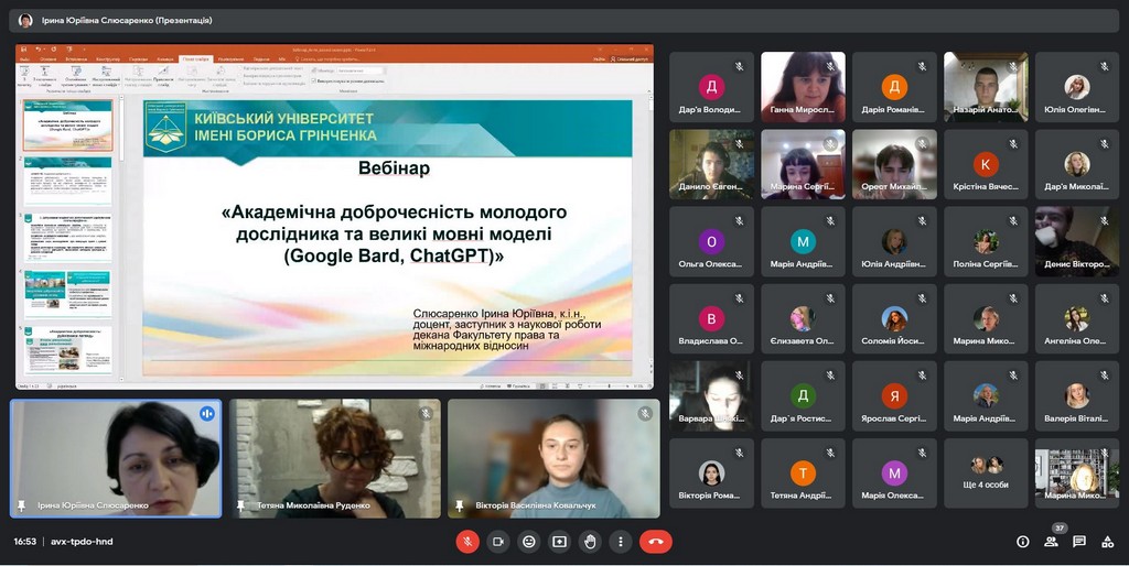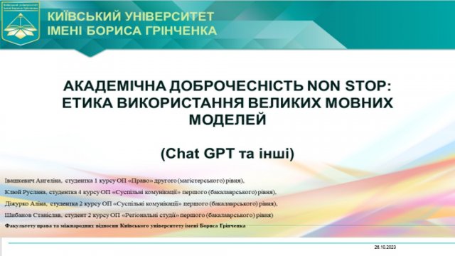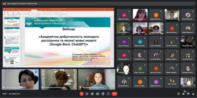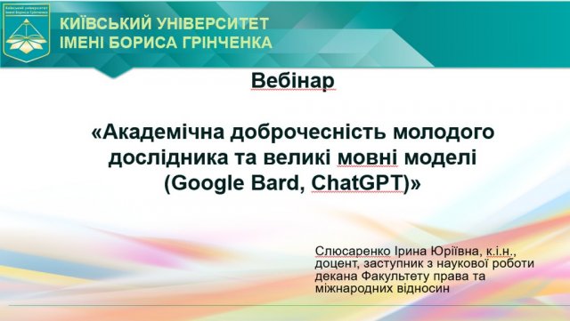25 жовтня 2023 р. на Факультеті права та міжнародних відносин Київського університету імені Бориса Грінченка і в рамках Школи академічної доброчесності Наукового товариства Університету відбувся вебінар «Академічна доброчесність молодого дослідника та великі мовні моделі (Google Bard, ChatGPT)», який на запрошення Вікторії КОВАЛЬЧУК, викладачки кафедри міжнародних відносин, голови Наукового товариства студентів, аспірантів, докторантів та молодих вчених Факультету права та міжнародних відносин провела Ірина СЛЮСАРЕНКО, заступник декана з наукової роботи Факультету, к.і.н., доцент.