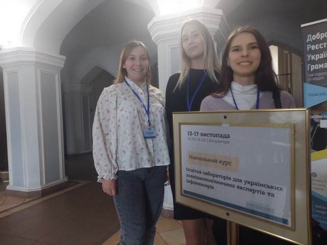 13-17 листопада 2023 року студенти 2-го курсу ОП «Суспільні комунікації» Юлія Могила, Варвара Шнякіна, Валерія Скорик та доцент кафедри міжнародних відносин, к.і.н. Тетяна Ілюк прослухали курс лекцій та воркшопів «Освітня лабораторія для українських зовнішньополітичних експертів та інфлюєнсерів», ініційований громадською організацією «Центр міжнародної безпеки» у співпраці з Дипломатична академія України імені Геннадія Удовенка при МЗС і KSN communications за підтримки Міжнародний фонд "Відродження".