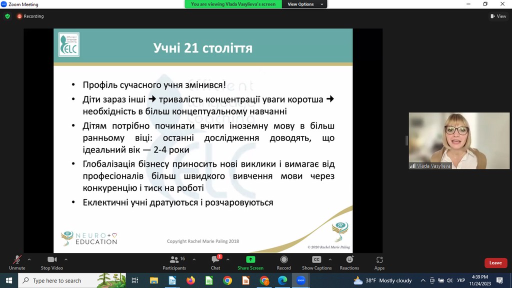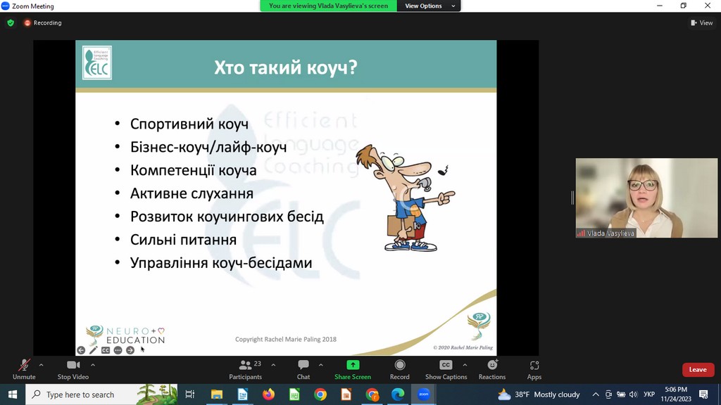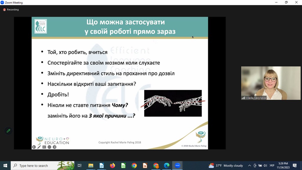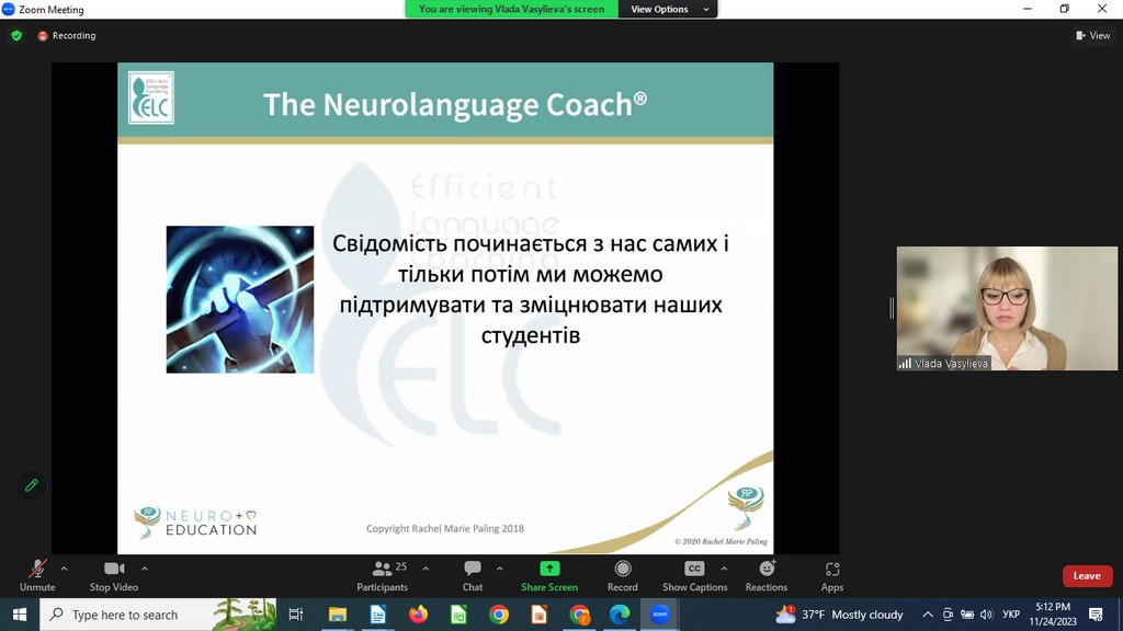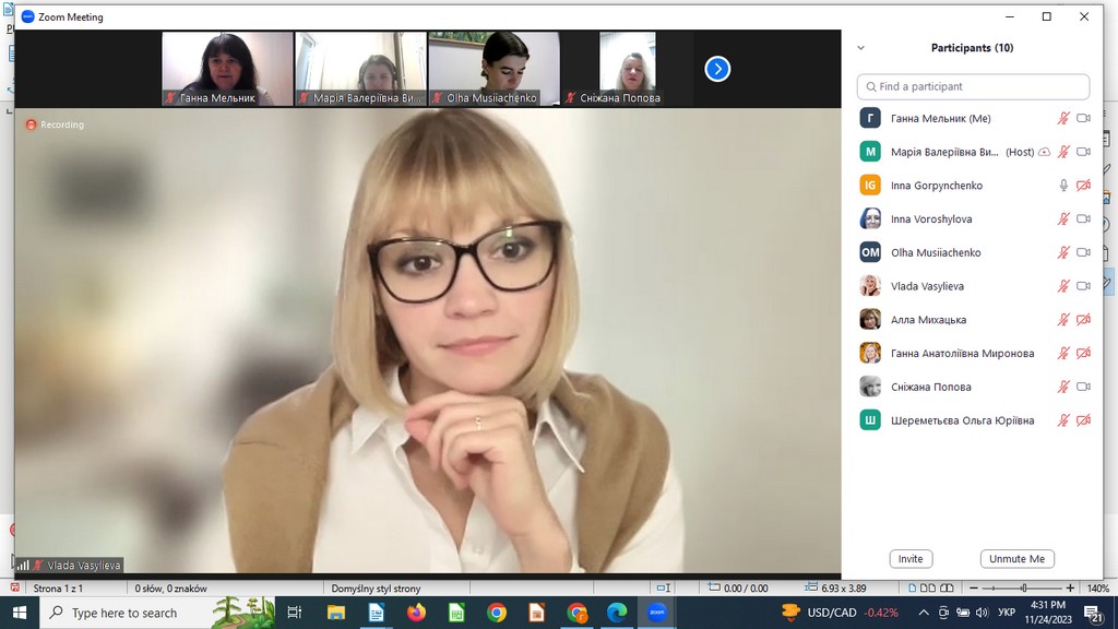 24 листопада 2023 року кандидат історичних наук, доцент, доцент кафедри міжнародних відносин, куратор групи СКб-1-22.4Од Ганна Мельник у рамках “Школи кураторів” взяла участь у вебінарі "Neurolanguage coaching © можливості використання для особистісного розвитку та у роботі зі студентами", який провела акредитований і сертифікований коуч в Україні Влада Васильєва. Тренерка наголосила на необхідності використання науково-педагогічними працівниками навичок активного слухання, що сприятиме залученості студентів до навчання і керівництву фокусом уваги студентів. А також порадила активніше використовувати індивідуальний партнерський стиль викладання для підтримки уваги і мотивації у студентів.