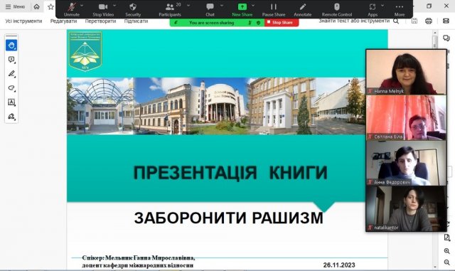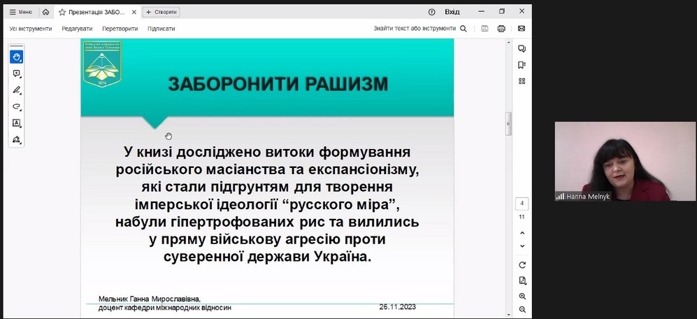 27 листопада 2023 року Мельник Ганна Мирославівна, кандидат історичних наук, доцент, доцент кафедри міжнародних відносин Факультету права та міжнародних відносин Київського університету імені Бориса Грінченка провела презентацію науково-публіцистичного видання «Заборонити рашизм» в Дрогобицькому державному педагогічному університеті імені Івана Франка.