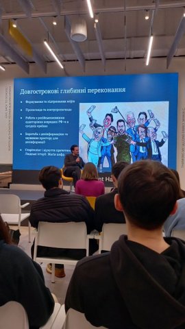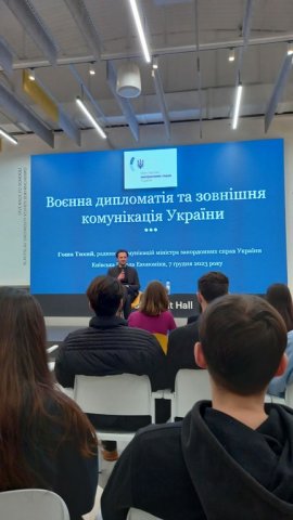 07 грудня 2023 р. професор кафедри міжнародних відносин Цвєтков О. Г. та доценти кафедри міжнародних відносин Брайчевська О. А. і Мельник Г. М., а також студенти 2 курсу освітньої програми “Суспільні комунікації” відвідали лекцію "Воєнна дипломатія та зовнішня комунікація України", яку провів у Київській школі економіки Г. Тихий, радник з комунікацій міністра закордонних справ України.