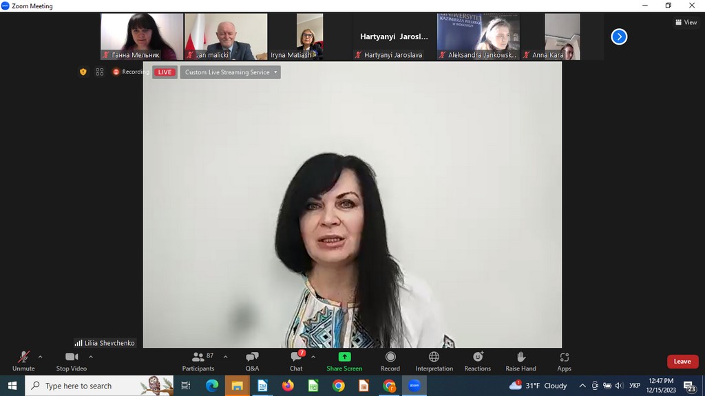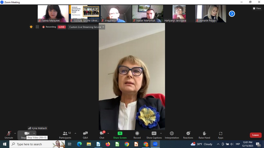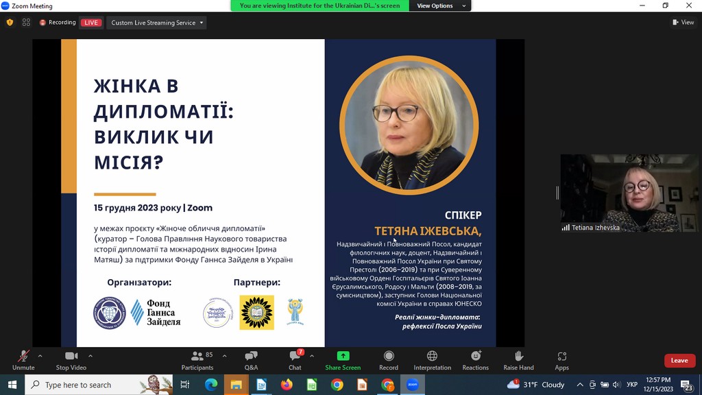 15 грудня 2023 року кандидат історичних наук, доцент, доцент кафедри міжнародних відносин Ганна Мельник взяла участь в онлайн-заході "Жінка в дипломатії: виклик чи місія?", який проходив у межах реалізації проєкту Наукового товариства історії дипломатії та міжнародних відносин "Жіноче обличчя дипломатії" (куратор - професор Ірина Матяш). Організаторами події стали Наукове товариство історії дипломатії та міжнародних відносин, Фонд ГаннсаЗайделя в Україні в партнерстві з Національним університетом "Острозька академія", Платформою "Подружжя українських дипломатів", Всеукраїнською громадською організацією "Територія Жінок".