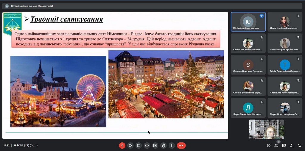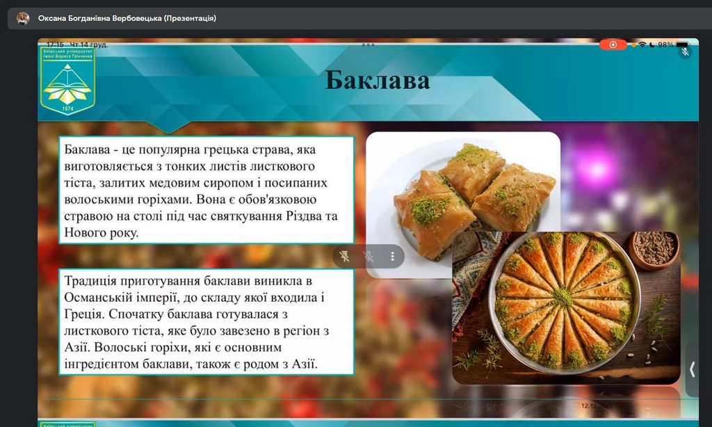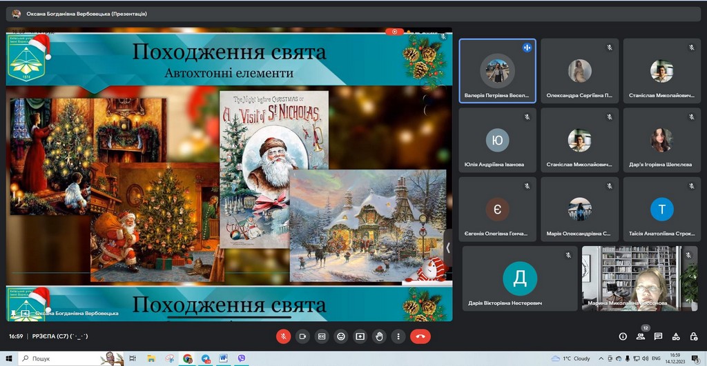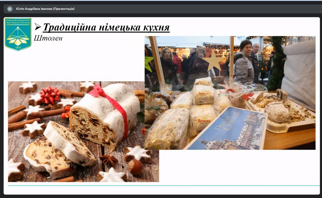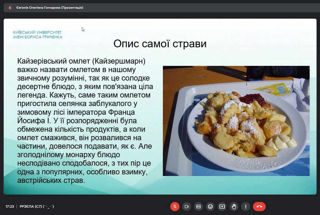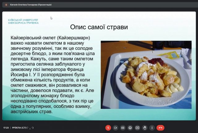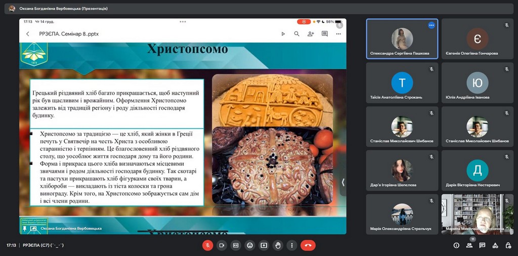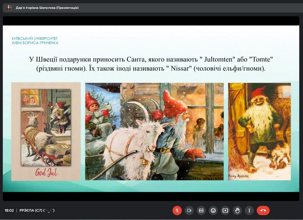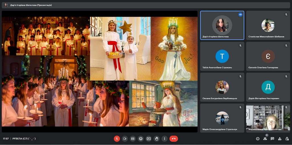 На жаль, дегустаційна складова не могла бути реалізована повною мірою: через підвищену активність країни-агресорки та загрозу ракетних обстрілів заняття були переведені у дистанційний формат. Втім, здобувачі третього курсу в онлайн форматі поділилися результатами своїх досліджень та кулінарних випробувань. Через призму свят зимового циклу здобувачі виявили поєднання дохристиянських та християнських мотивів у різдвяно-новорічних святкуваннях, культурні запозичення у Європі та Америці, походження інгрідієнтів традиційних страв, основні сюжети зимових святкувань та головних героїв. Прикро, що не всі здобувачі могли взяти участь у дегустації страв, власноруч приготовлених одногрупниками, однак всі присутні мали шанс дізнатися про труднощі та ресурсозатратність традиційних зимових наїдків, які формують святковий стіл у народів Європи та Північної Америки. На думку здобувачів такий практичний вимір навчання варто удосконалювати та впроваджувати і надалі.