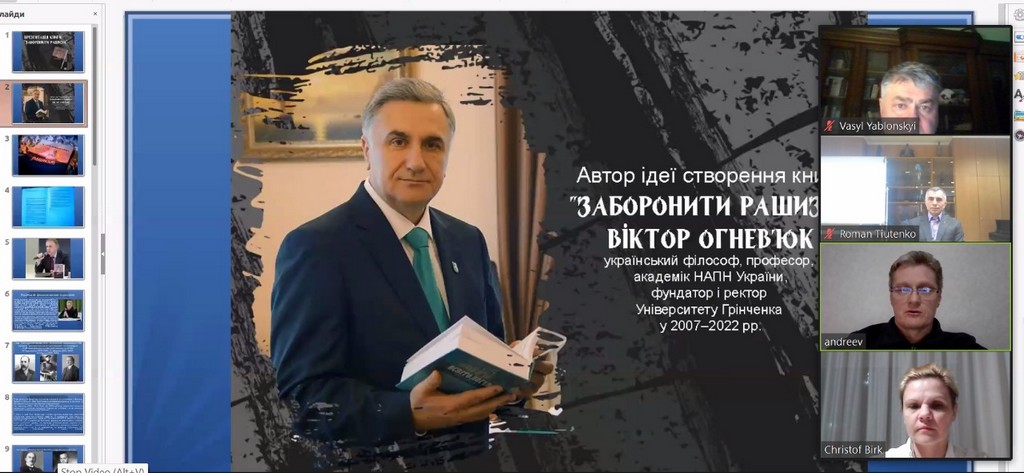 09 лютого 2024 року відбулася спільна презентація наукових видань “Заборонити рашизм” (В.Огнев’юк (світлої Пам'яті), В.Андрєєв, В.Брехуненко, М.Відейко, Б.Гуменюк, І.Гирич, Л.Масенко, Ю.Митрофаненко, В.Огризко, О.Палій, В.Піскун, П.Полянський, В.Сергійчук, П.Чернега; за заг.ред. В.Піскун) та “Просторові межі українського світу: комплекс уявлень та їхня реалізація в ранньомодерній Україні (XVI–XVIII ст.)” (В.Брехуненко, П.Бойко, А. Заяць). Онлайн подія відбулася в контексті співробітництва Київського столичного університету імені Бориса Грінченка з Українським вільним університетом (м. Мюнхен, ФРН), як один з напрямів академічної та наукової співпраці, а також як складова інтенсифікації наукового співробітництва.