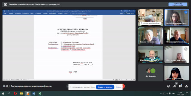 16 квітня 2024 р. відбулось засідання кафедри під час якого робочі групи представили зміни внесені в освітньо-професійні програми на основі, отриманих пропозицій протягом 2021-2023 рр., які надійшли шляхом анкетування та опитування стейкхолдерів. Науково-педагогічні працівники кафедри міжнародних відносин також висловили свої думки про вдосконалення освітньо-професійних програм.