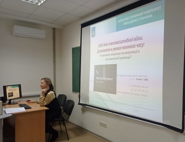 Про сучасні пріоритети української дипломатії та механізми їх практичної реалізації під час повномасштабного вторгнення студентам 1-го курсу освітньо-професійної програми «Суспільні комунікації» 18 листопада 2024 року розповіла доцент кафедри міжнародних відносин, кандидат історичних наук Тетяна ІЛЮК під час лекції на тему: «1000 днів повномасштабної війни. Дипломатія в умовах воєнного часу: як змінилася аналітика та комунікації в дипломатичній практиці?», що відбулася в рамках дисципліни «Вступ до спеціальності» блоку «Університетські студії».
