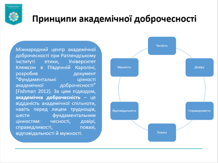 На зустрічі було зактуалізовано поняття «академічної доброчесності»; розглянуто нормативні документи щодо академічної доброчесності; наголошено на принципах, основних порушеннях та можливих варіантах відповідальності за порушення академічної доброчесності. Також було розглянуто проєкти сприяння академічній доброчесності в Україні. Значну частину заходу було присвячено практичним аспектам запобігання порушень академічної доброчесності.