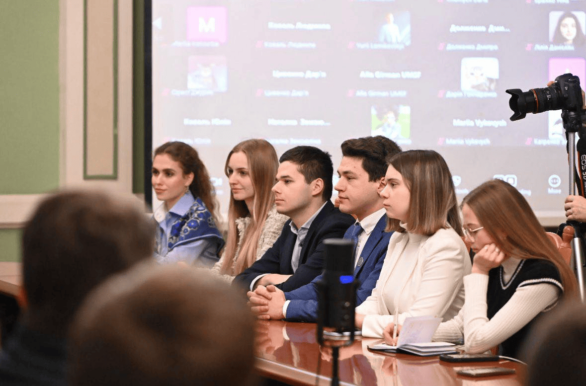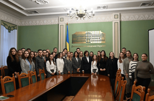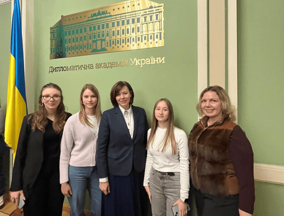До зустрічі, що проходила у Дипломатичній академії України, долучилися і студентки 2-го курсу Факультету права та міжнародних відносин Київського столичного університету імені Бориса Грінченка Софія Дмитренко, Юлія Демська та Анастасія Зімбіцька під керівництвом доцентки кафедри міжнародних відносин, очільниці Інформаційно-аналітичного центру ФПМВ Тетяни Ілюк. Представниці Університету Грінченка поділилися з присутніми власними напрацюваннями в царині публічної дипломатії, розповіли про роботу щодо формування практичних навиків реалізації проєктів публічної дипломатії на Факультеті права та міжнародних відносин, про наявні проєкти промоції України в студентському середовищі зарубіжних країн та дослідження з публічної дипломатії, які проводяться при Інформаційно-аналітичному центрі ФПМВ.