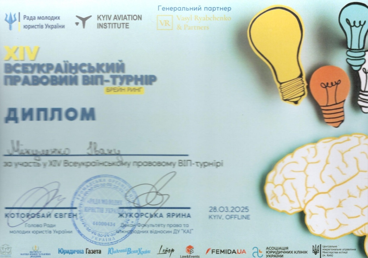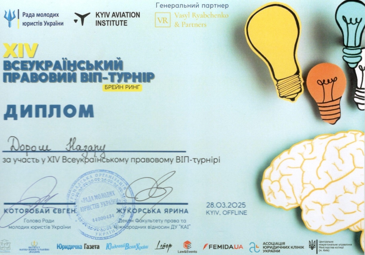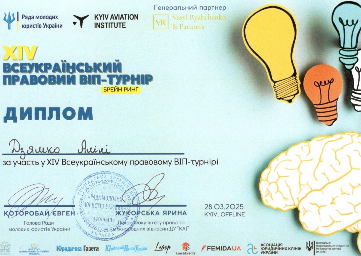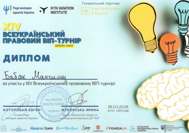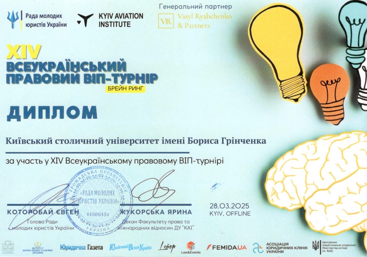 28 березня 2025 року команда «ЮК АСТРЕЯ» Факультету права та міжнародних відносин Університету Грінченка (Максим БАБЯК, Аліна ДЗЯМКО, Євгенія МІНІНА, Нараз ДОРОШ, Іван МІКУЛЕНКО – студенти ІІ, ІІІ та V курсів) взяла участь у щорічному Всеукраїнському правовому ВІП-турнірі, де мала можливість продемонструвати свої теоретичні та практичні уміння, знання та навички.