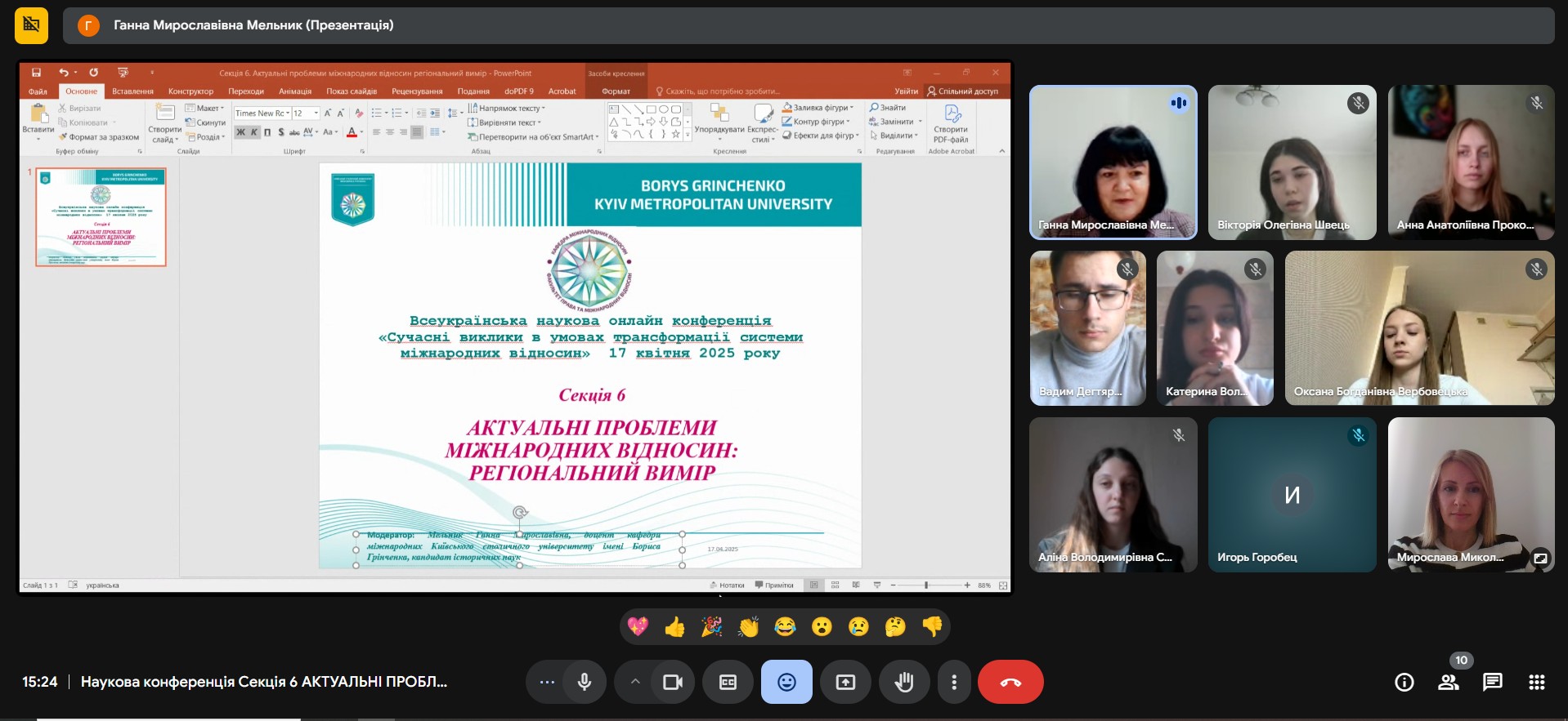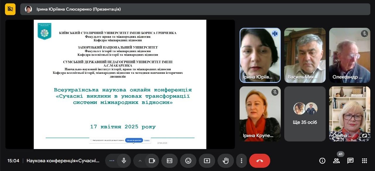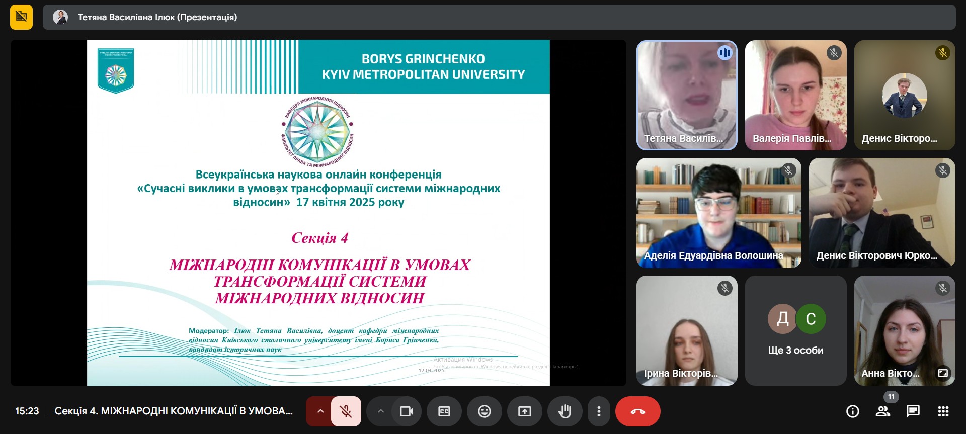 17 квітня 2025 р. на кафедрі міжнародних відносин Факультету права та міжнародних відносин Київського столичного університету імені Бориса Грінченка відбулася Всеукраїнська наукова онлайн конференція «Сучасні виклики в умовах трансформації системи міжнародних відносин». Співорганізаторами конференції виступили профільні кафедри Запорізького національного університету та Сумського державного педагогічного університету імені А.С. Макаренка.