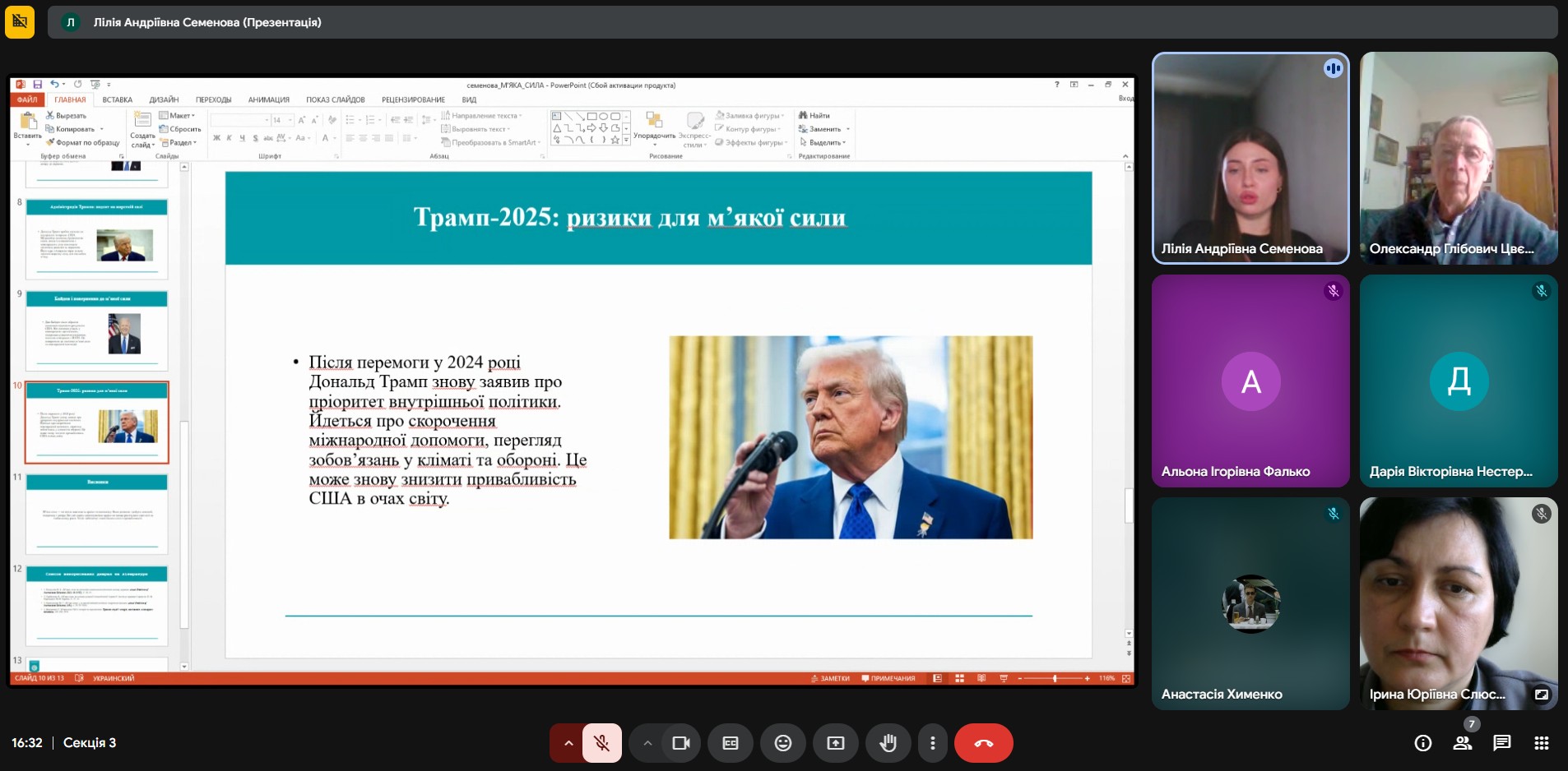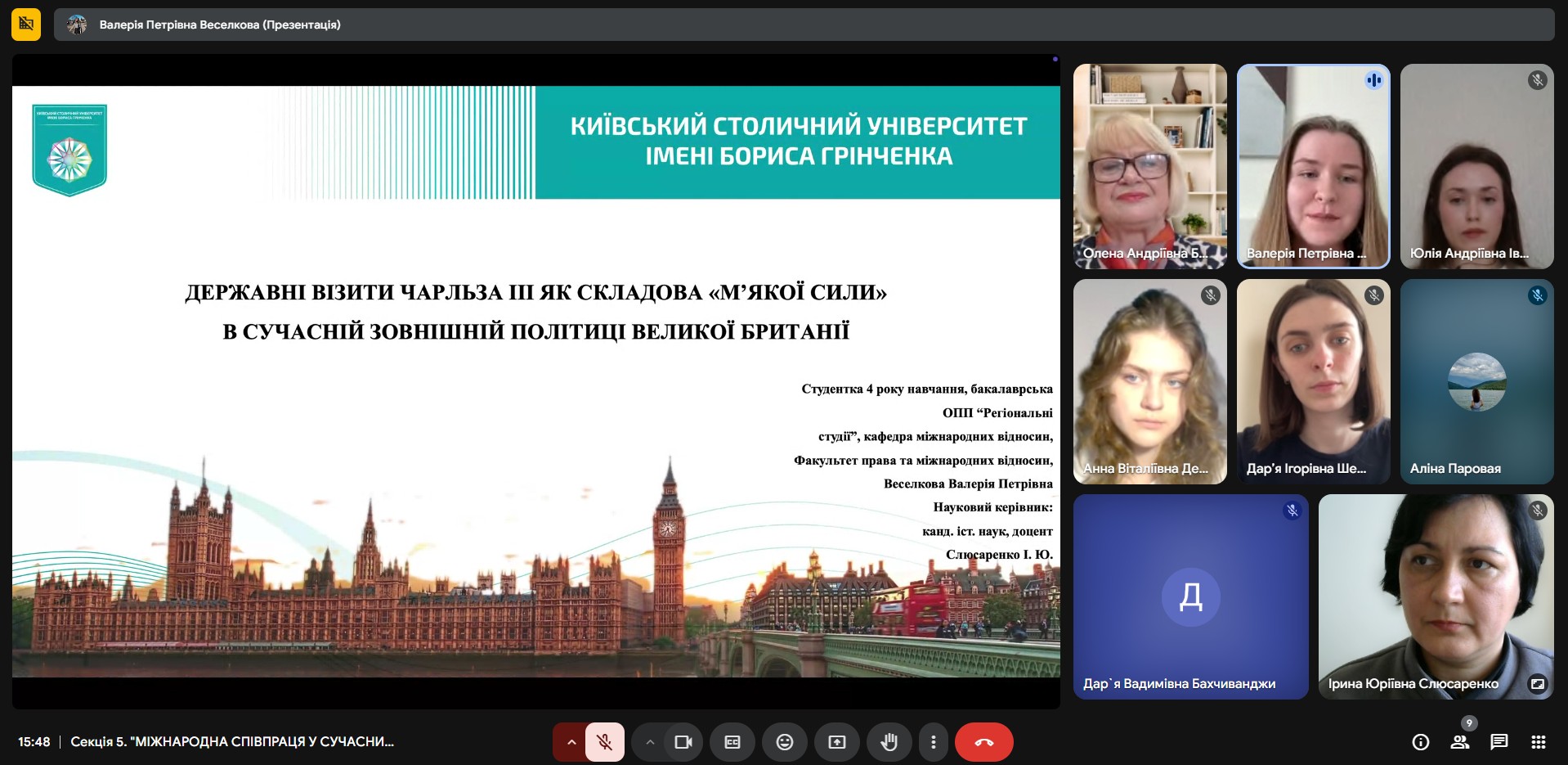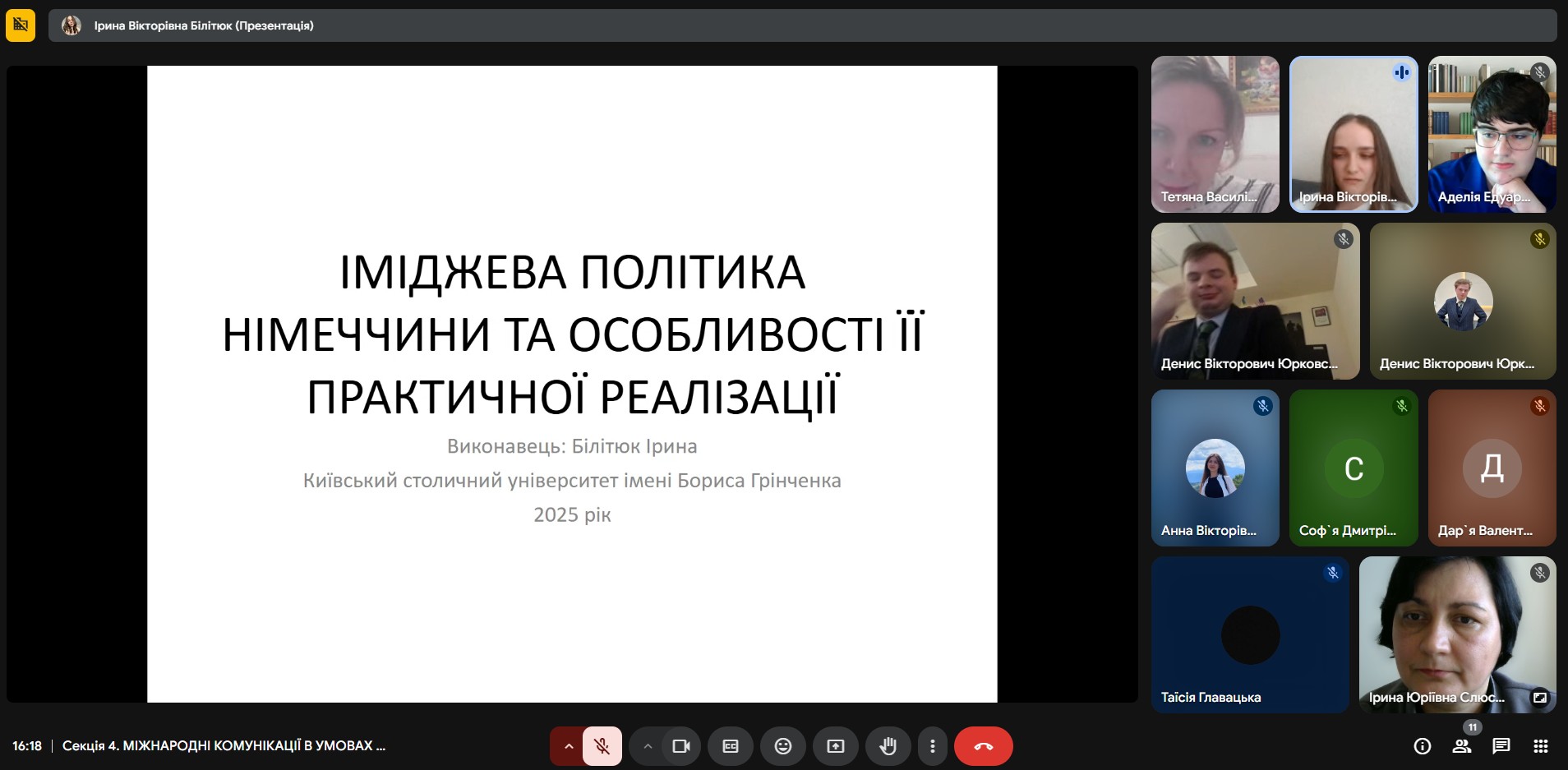 17 квітня 2025 р. на кафедрі міжнародних відносин Факультету права та міжнародних відносин Київського столичного університету імені Бориса Грінченка відбулася Всеукраїнська наукова онлайн конференція «Сучасні виклики в умовах трансформації системи міжнародних відносин». Співорганізаторами конференції виступили профільні кафедри Запорізького національного університету та Сумського державного педагогічного університету імені А.С. Макаренка.