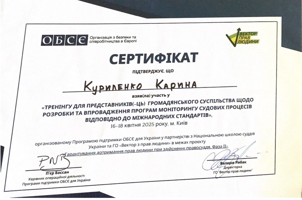 У період з 16 по 18 квітня 2025 року студентка 3 курсу спеціальності «Міжнародне право» Куриленко Карина успішно пройшла конкурсний відбір та взяла участь у триденному тренінгу «Моніторинг судових процесів». Захід було організовано в межах проєкту «Гарантування дотримання прав людини при здійсненні правосуддя, Фаза ІІ» Програми підтримки ОБСЄ для України у співпраці з Національною школою суддів України та громадською організацією «Вектор прав людини».