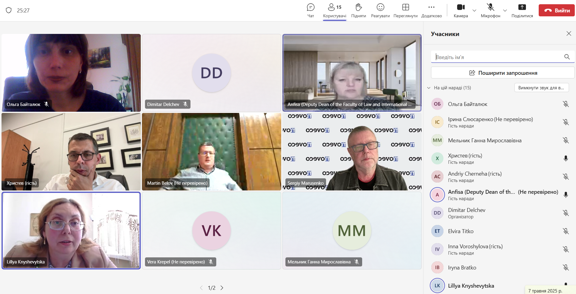 07 травня 2025 р. відбулася перша установча онлайн-зустріч між викладачами Факультету права та міжнародних відносин та представниками Софійського університету імені Святого Климента Охридського (Республіка Болгарія). Подія стала важливим кроком у розвитку міжнародної академічної співпраці та поглибленні партнерських зв’язків між двома провідними навчальними закладами.