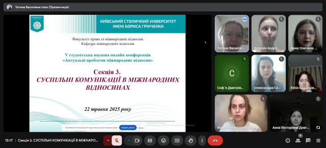 На Факультеті права та міжнародних відносин 22 травня 2025 року відбулася вже V Студентська наукова онлайн конференція «Актуальні проблеми міжнародних відносин», яку організував та провів колектив кафедри міжнародних відносин. Здобувачі спеціальності 291 «Міжнародні відносини, суспільні комунікації та регіональні студії» отримали можливість апробувати результати власних досліджень, подискутувати, обмінятися ідеями та досвідом.