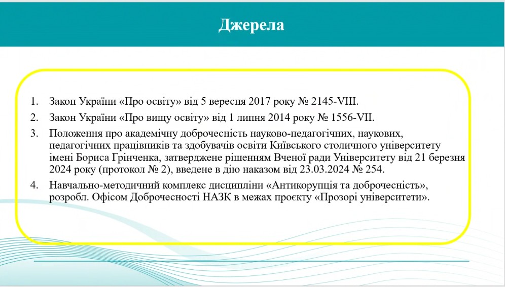 Учасники розглянули нормативно-правову базу, термінологію, ключові проблеми порушення академічної доброчесності: академічний плагіат, фальсифікація та фабрикація даних, списування та інші форми академічної недоброчесності. Лекторка детально пояснила відповідальність за такі дії для різних категорій учасників освітнього процесу. Особливу увагу було приділено важливості формування культури академічної доброчесності серед здобувачів та науково-педагогічних працівників. Не оминули під час заходу увагою й новий документ – «Політика використання штучного інтелекту в Київському столичному університеті імені Бориса Грінченка», який визначає засади, правила та принципи впровадження і застосування інструментів ШІ в Університеті.