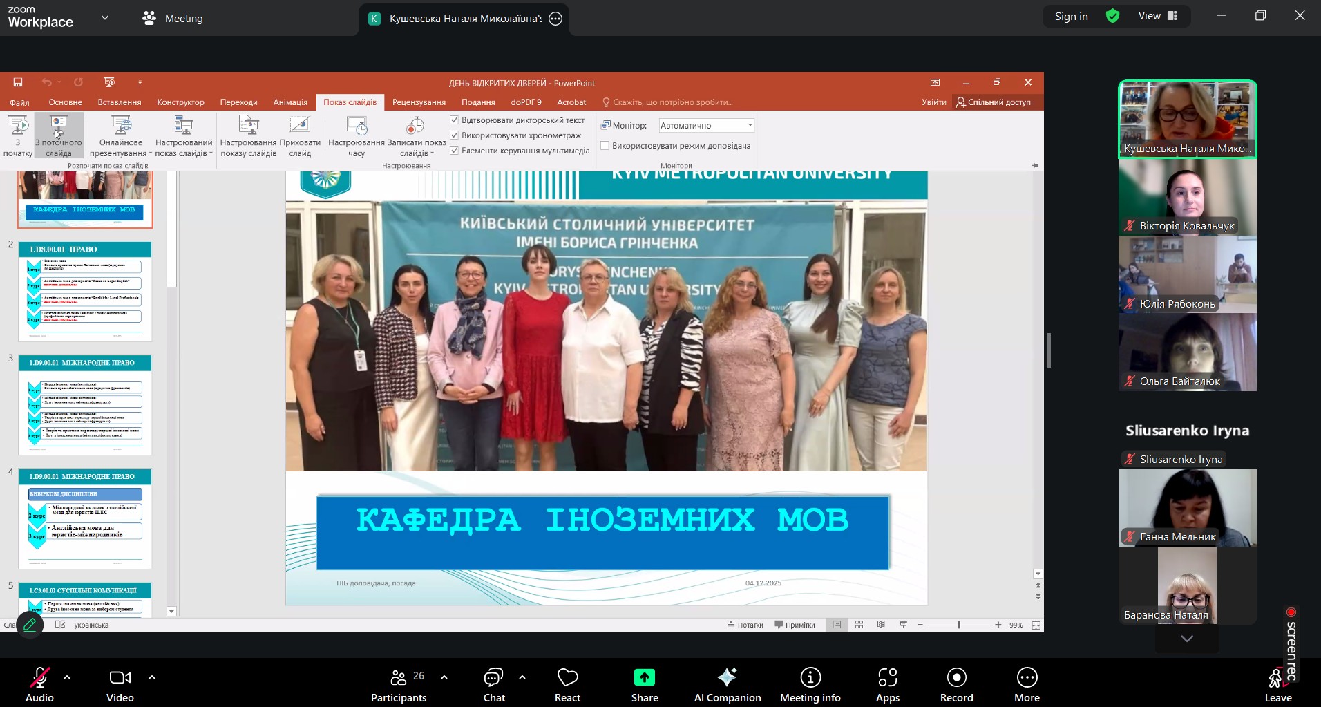 04 грудня 2025 року на Факультеті права та міжнародних відносин відбувся онлайн День відкритих дверей, участь у якому взяли ЗОШ, Ліцеї та фахові Коледжі Києва та України, серед яких відзначимо: Ліцей «Фінансовий» Подільського району м. Києва, Ліцей №49 Шевченківського району м. Києва, Ліцей № 30 «ЕКОНАД» Дніпровського району м. Києва, Ліцей № 80 Печерського району м. Києва, Опорний Заклад Освіти Юрівський ліцей Гатненської сільської ради Фастівського району Київської області, Радомишльський ліцей №3 Житомирської області, фаховий Коледж «Універсум» Київського столичного університету імені Бориса Грінченка