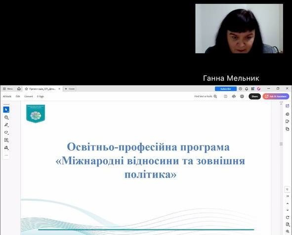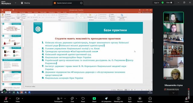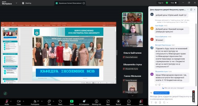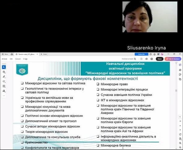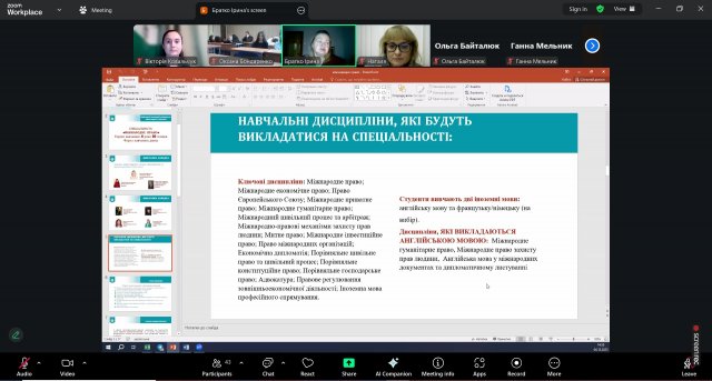 Під час онлайн зустрічі представники всіх кафедр Факультету, а саме: доцентки кафедри міжнародних відносин, гарантки освітніх програм першого (бакалаврського) рівня освіти «Суспільні комунікації» (Слюсаренко І.Ю.) та «Міжнародні відносини та зовнішня політика» (Мельник Г.М.), старша викладачка кафедри, Голова Наукового товариства Факультету Ковальчук В.В., завідувачка кафедри міжнародного права, європейської та євроатлантичної інтеграції, доцентка (Братко І.В), старша викладачка кафедри приватного права (Байталюк О.М.), старша викладачка кафедри іноземних мов (Кушевська Н.М.) розповіли майбутнім абітурієнтам про зміст підготовки за кожною програмою, ключові навчальні дисципліни, основні бази практик, перспективи працевлаштування випускників та діяльність центрів компетентностей, які діють на базі кафедр.