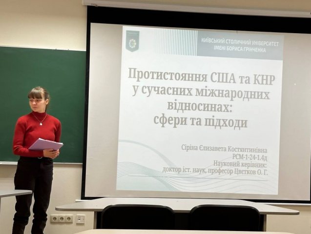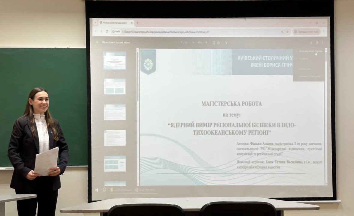 Цьогорічні роботи здобувачів ОП «Регіональні студії» виявилися сфокусованими на Азійсько-Тихоокеанському регіоні. Так студенти, завдяки можливостям побудови індивідуальної освітньої траєкторії, запропонували власні теми дослідження та зосередилися на вивченні культурної дипломатії Республіки Корея в першій чверті ХХІ ст. (Анна Бойченко), основних напрямках зовнішньої політики Японії в період кризи глобальної безпеки першої чверті ХХІ ст. (Богдан Рекуненко), ядерному вимірі регіональної безпеки в Індо-Тихоокеанському регіоні (Альона Фалько) та протистоянні США та КНР у сучасних міжнародних відносинах (Єлизавета Сіріна). Крім того, випускники ОП «Регіональні студії» захищали кваліфікаційні роботи, пов’язані з питаннями впливу президентської кампанії та результатів виборів 2024 року у США на українсько-американські відносини (Єгор Гурин) та проблемою розширення НАТО у першій чверті ХХІ ст. (Володимир Приходько). Екзаменаційна комісія відзначила як найкращу – роботу Єлизавети Сіріної на тему «Протистояння США та КНР у сучасних міжнародних відносинах: сфери та підходи» (науковий керівник – професор кафедри міжнародних відносин, д.і.н., ст.наук. співробітник О.Г. Цвєтков).