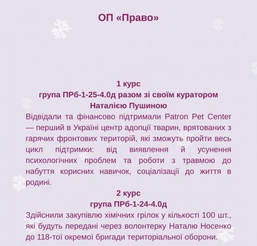 Кожного року, напередодні Різдва Христового, на Факультеті права та міжнародних відносин традиційно відбувається масштабний благодійний Марафон добрих справ. Кожна академічна група обирає саме СВІЙ доброчинний напрям, в межах якого здійснює СВОЮ посильну допомогу та СВОЄ маленьке диво.