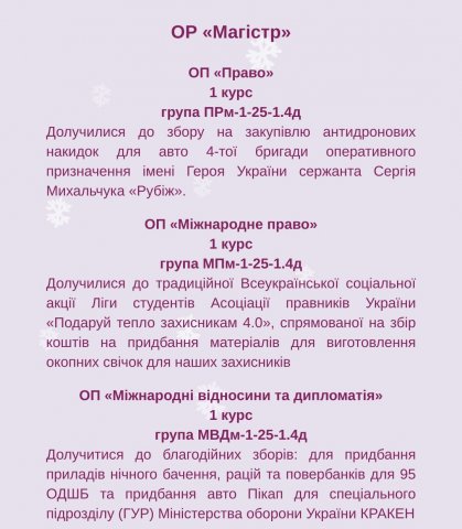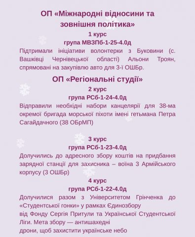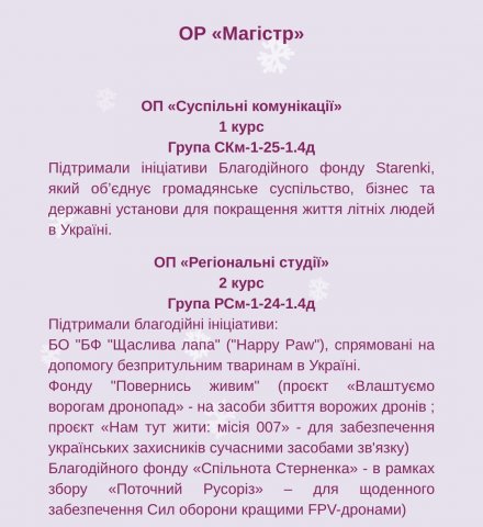 Отже, в межах «Благодійного різдвяного Марафону добрих справ - 2025» кожна академічна група Факультету взяла участь в окремій благодійній ініціативі. Детальніше можете ознйомитись на фото.