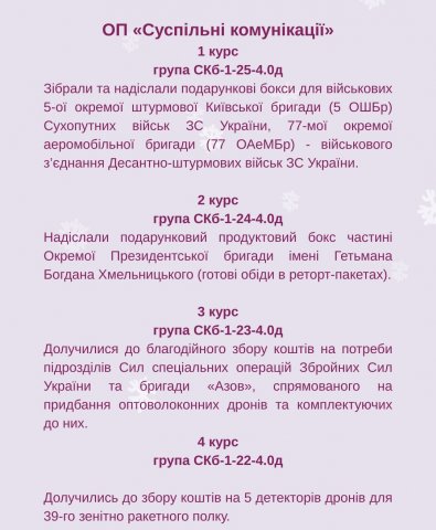 Дякуємо всім нашим студентам за небайдужість та бажаємо, щоб в переддень великого свята саме ВАШЕ диво постукало до вас у двері і подарувало кожному здійснення найзаповітніщих мрій, а наступний 2026 рік приніс всім українцям МИР, на який ми так чекаємо!