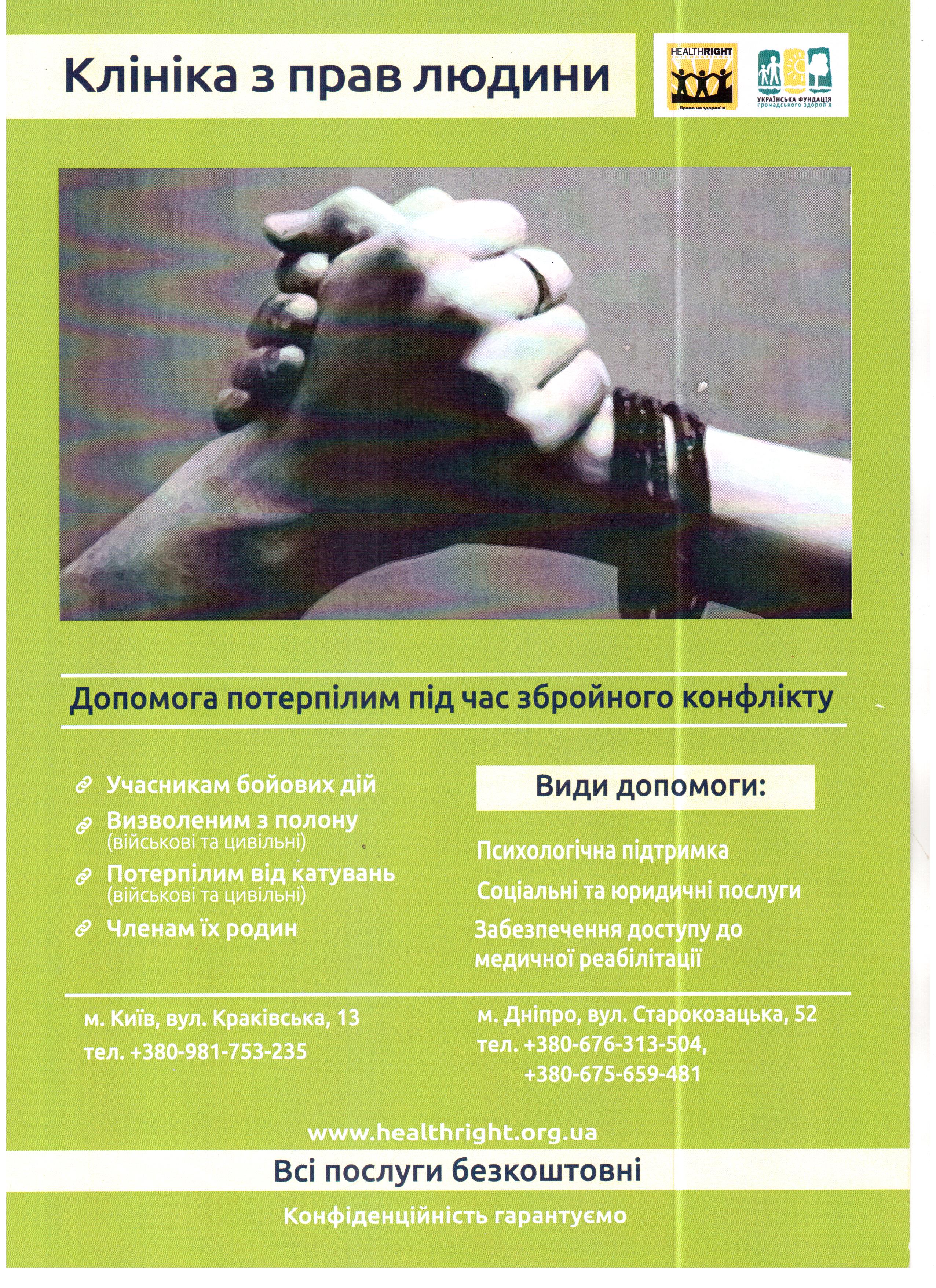 БЕЗКОШТОВНО надається психологічна підтримка, соціальні та юридичні послуги, забезпечується доступ до медичної реабілітації учасникам бойових дій, визволеним з полону (військових та цивільних), потерпілим від катувань (військових та цивільних) та членам родин потерпілих.