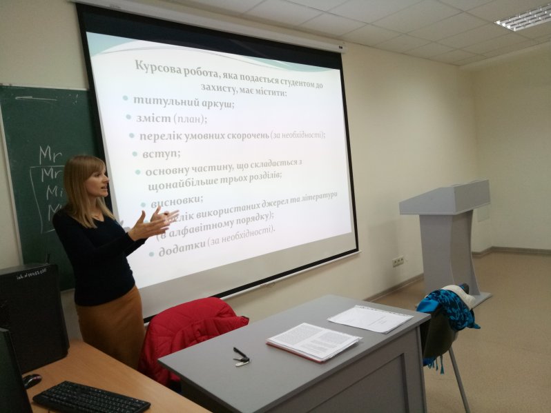 17.11.2017 р. для студентів 2 курсу освітніх програм «Країнознавство» та «Міжнародна інформація» був проведений Науково-практичний семінар «Наукове дослідження: структура, специфіка та правила оформлення». Захід покликаний сприяти формуванню навичок наукового пошуку, правильного виконання наукових робіт. Старший викладач кафедри М.М. Лісовська ознайомила студентів з основними структурними елементами, правилами оформлення наукових, зокрема курсових робіт.