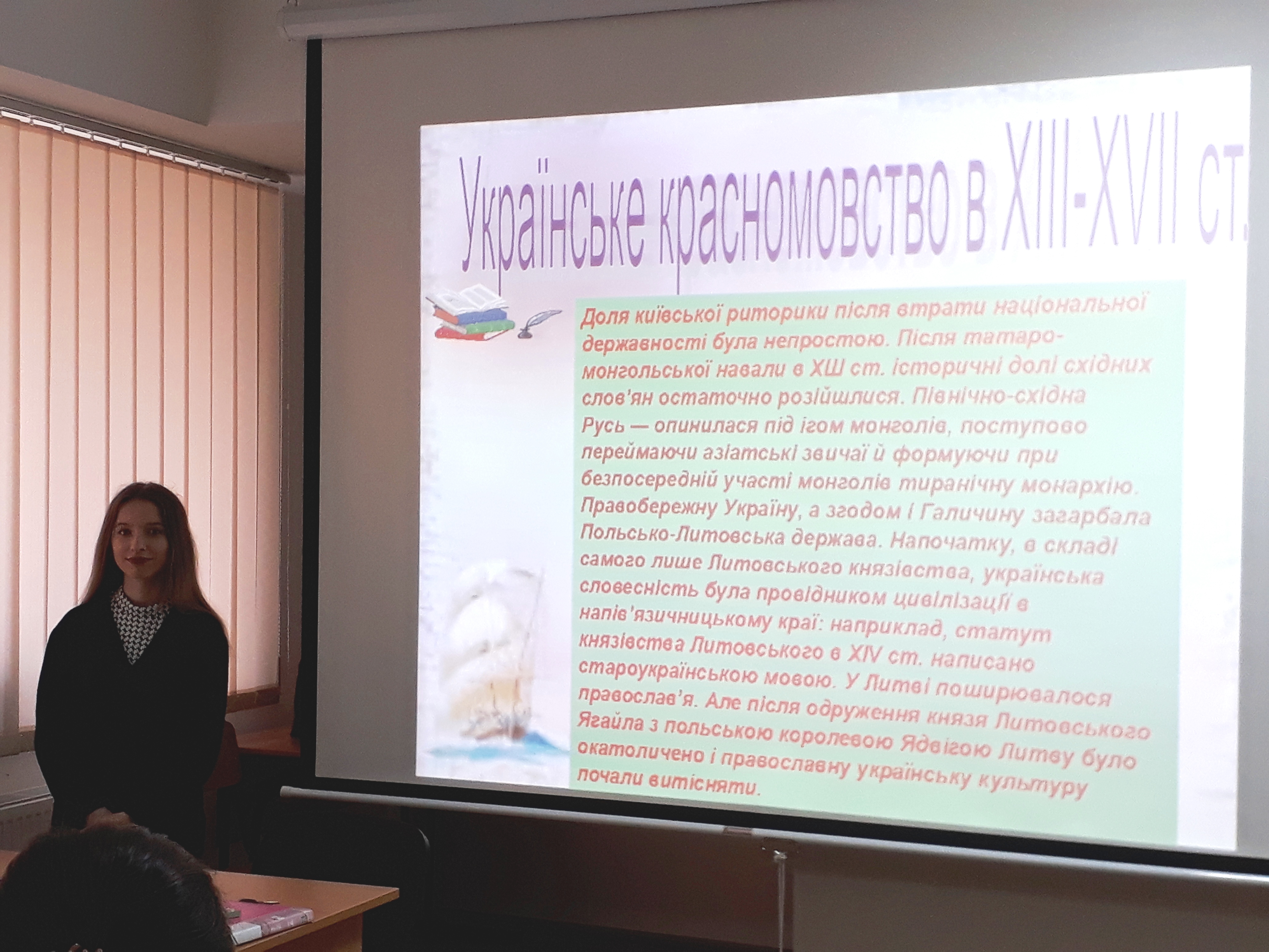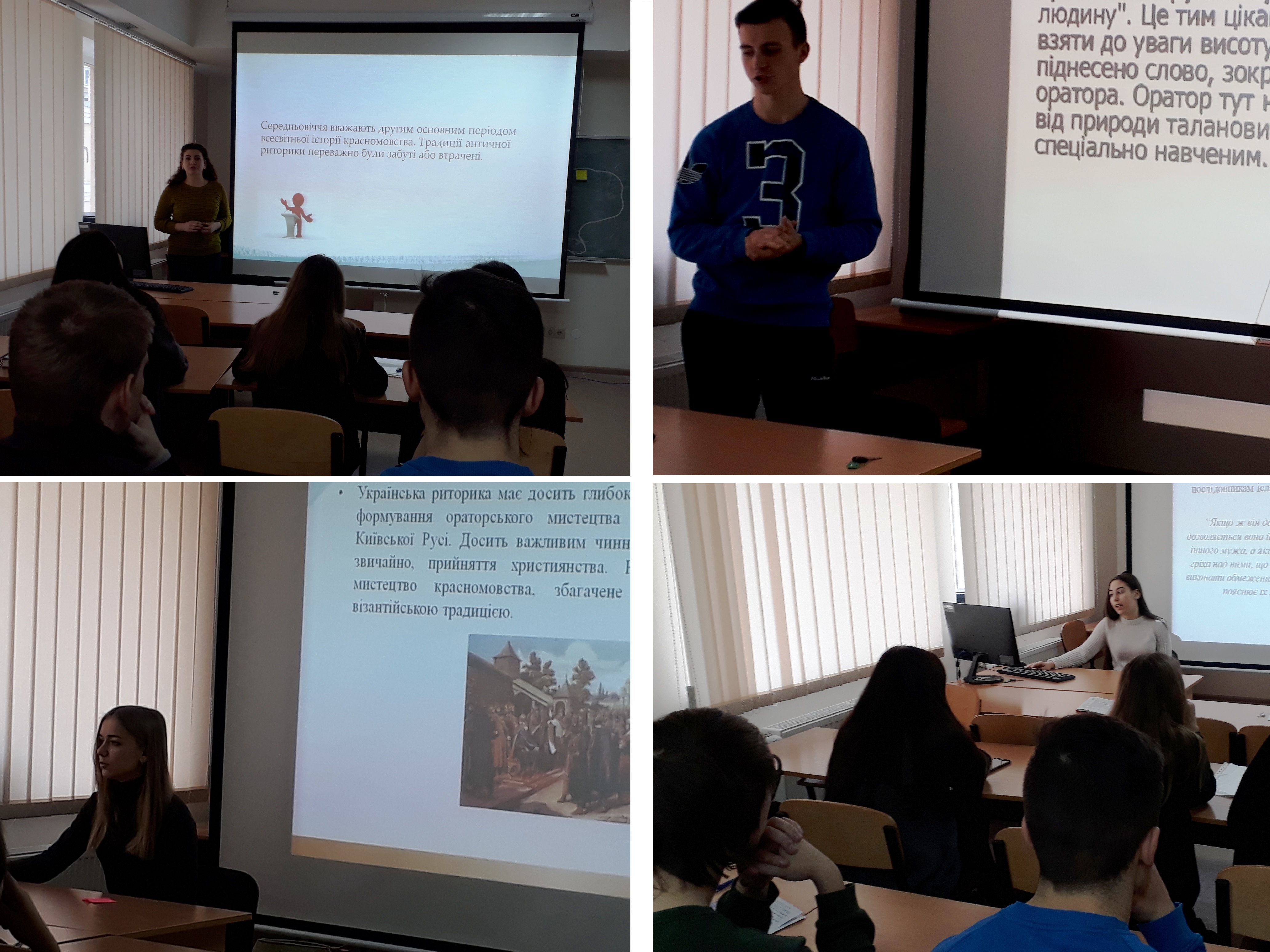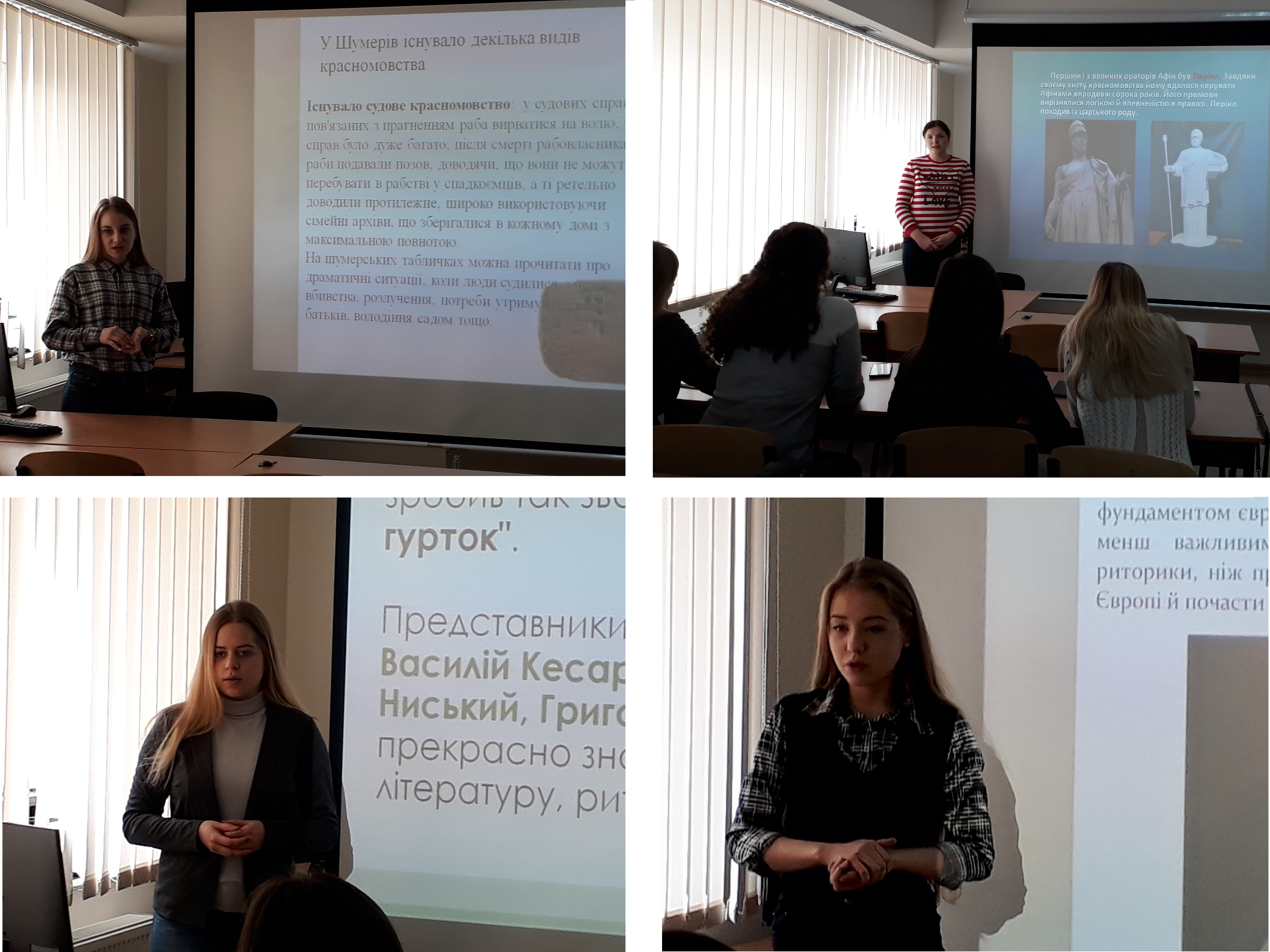 Вміння красиво і правильно говорити рідною мовою, вміння переконувати співрозмовника, привертати увагу й здобувати довіру слухачів потрібне нам у різних сферах життя, зокрема, для досягнення успіху в професії юриста. Тому в рамках заходу було розглянуто та проаналізовано основні етапи розвитку мови та риторики.