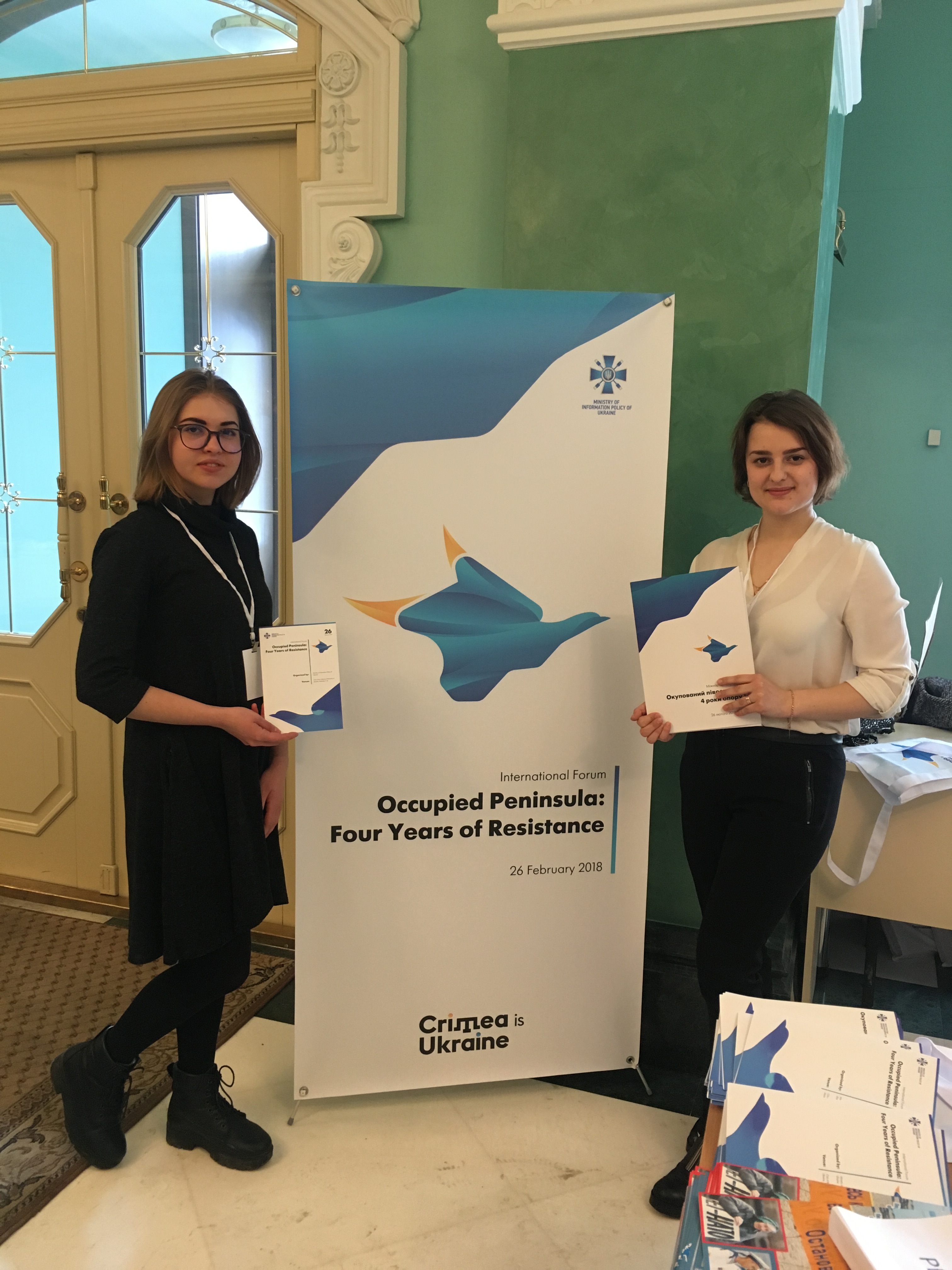 26 лютого, на запрошення Міністерства інформаційної політики України, голова департаменту з розвитку міжнародних проектів – студентка ІІ курсу спеціальності «Країнознавство» Добридень Альона та студентки спеціальності «Міжнародна інформація» Вікторія Хомутська та Євгенія Івашура долучились до організації та проведення ІV Міжнародного форуму «Окупований півострів: чотири роки опору» (200 учасників та 30 спікерів).