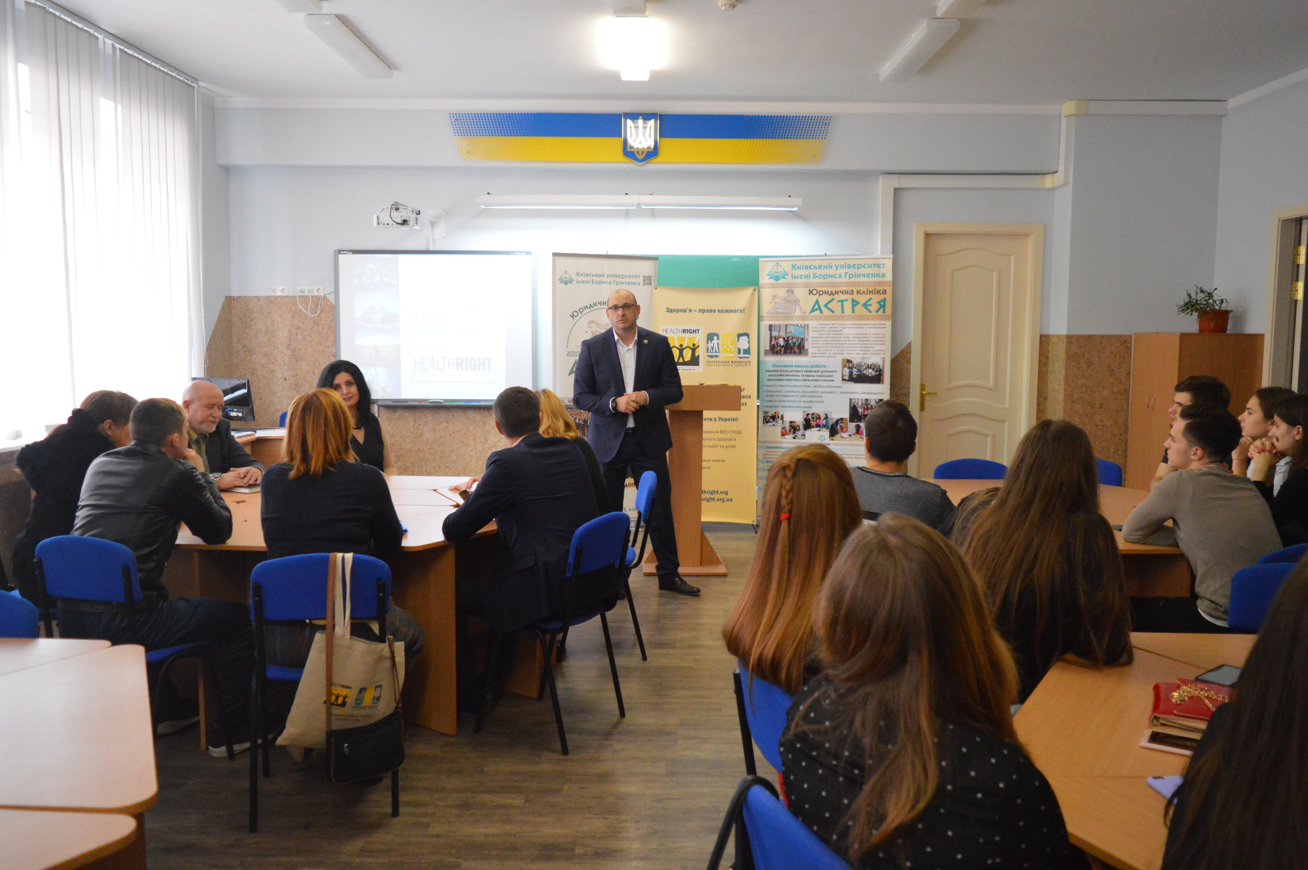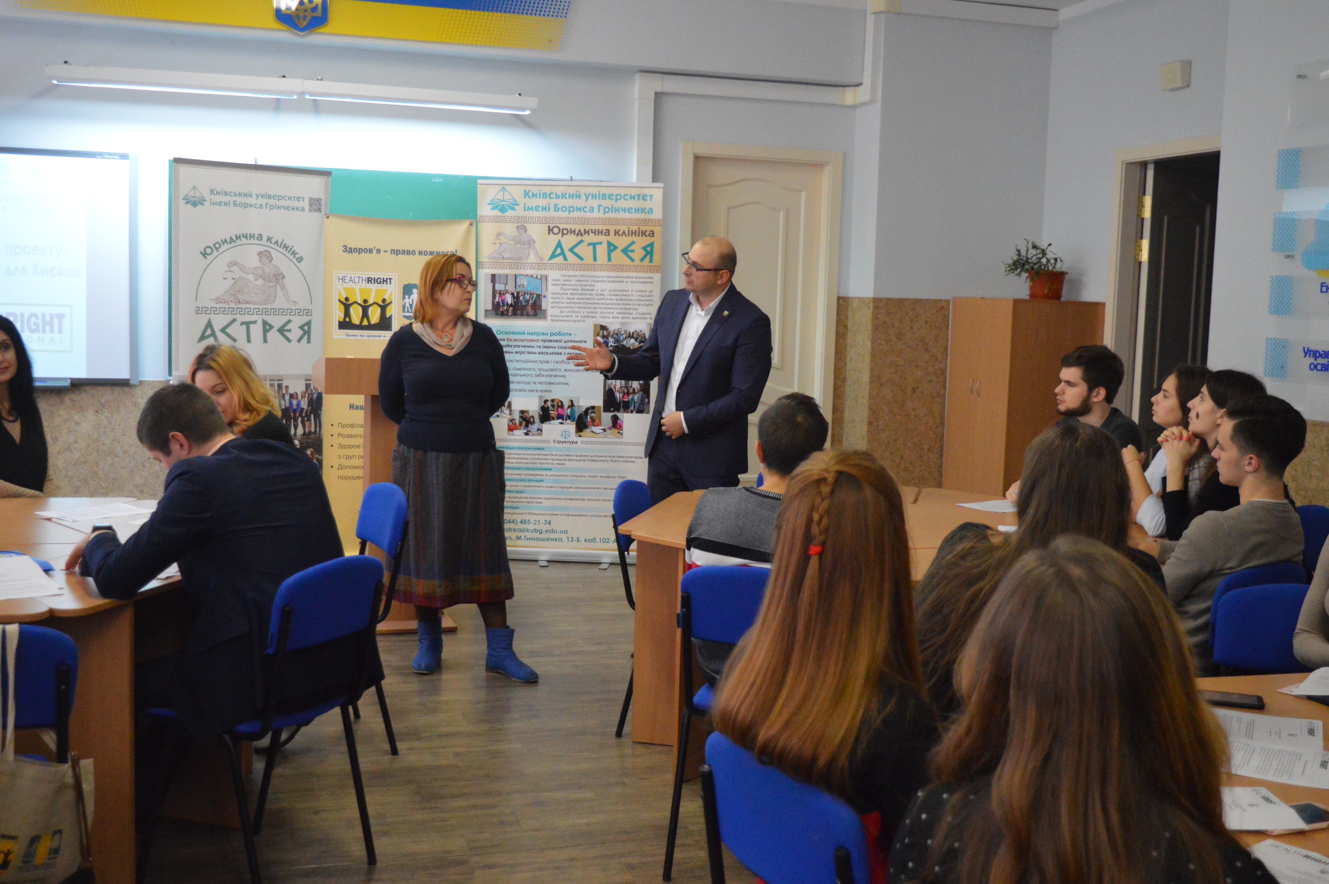 03 листопада 2018 року, на базі Київського університету імені Бориса Грінченка, в рамках соціального проекту «З Києвом і для Києва», представництво в Україні HealthRightInternational – Клініка з прав людини «Право на здоров’я» та колектив ЮК «Астрея» Факультету права та міжнародних відносин Київського університету імені Бориса Грінченка, організували та провели спільний захід зорієнтований на забезпечення доступу до соціально-правової та психологічної допомоги учасникам бойових дій (зони АТО) та членам їхніх родин.